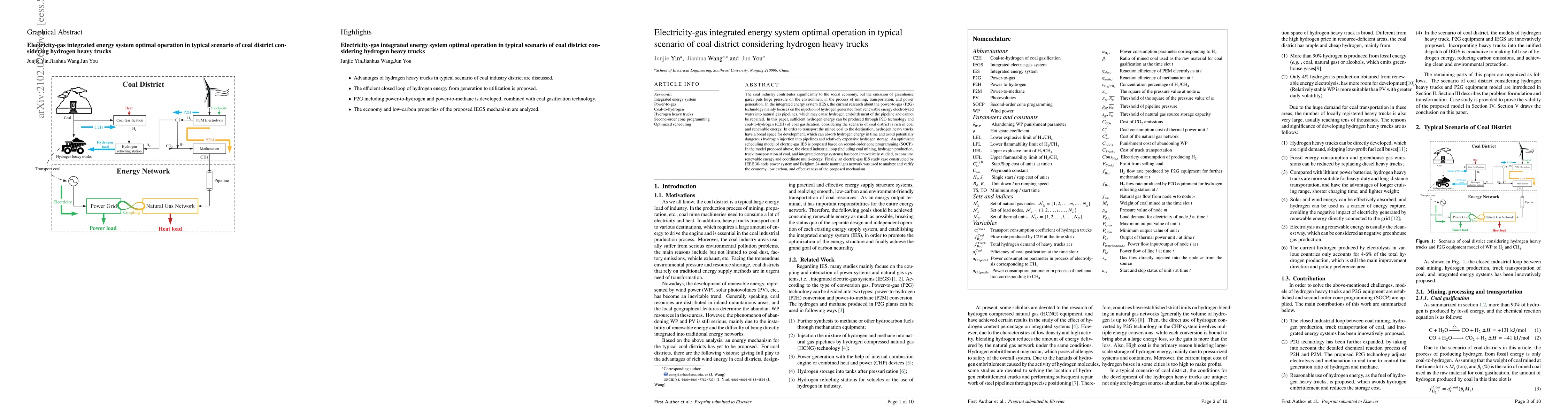 The coal industry contributes significantly to the social economy, but the emission of greenhouse gases puts huge pressure on the environment in the process of mining, transportation, and power generation. In the integrated energy system (IES), the current research about the power-to-gas (P2G) technology mainly focuses on the injection of hydrogen generated from renewable energy electrolyzed water into natural gas pipelines, which may cause hydrogen embrittlement of the pipeline and cannot be repaired. In this paper, sufficient hydrogen energy can be produced through P2G technology and coal-to-hydrogen (C2H) of coal gasification, considering the scenario of coal district is rich in coal and renewable energy. In order to transport the mined coal to the destination, hydrogen heavy trucks have a broad space for development, which can absorb hydrogen energy in time and avoid potentially dangerous hydrogen injection into pipelines and relatively expensive hydrogen storage. An optimized scheduling model of electric-gas IES is proposed based on second-order cone programming (SOCP). In the model proposed above, the closed industrial loop (including coal mining, hydrogen production, truck transportation of coal, and integrated energy systems) has been innovatively studied, to consume renewable energy and coordinate multi-energy. Finally, an electric-gas IES study case constructed by IEEE 30-node power system and Belgium 24-node natural gas network was used to analyze and verify the economy, low carbon, and effectiveness of the proposed mechanism.