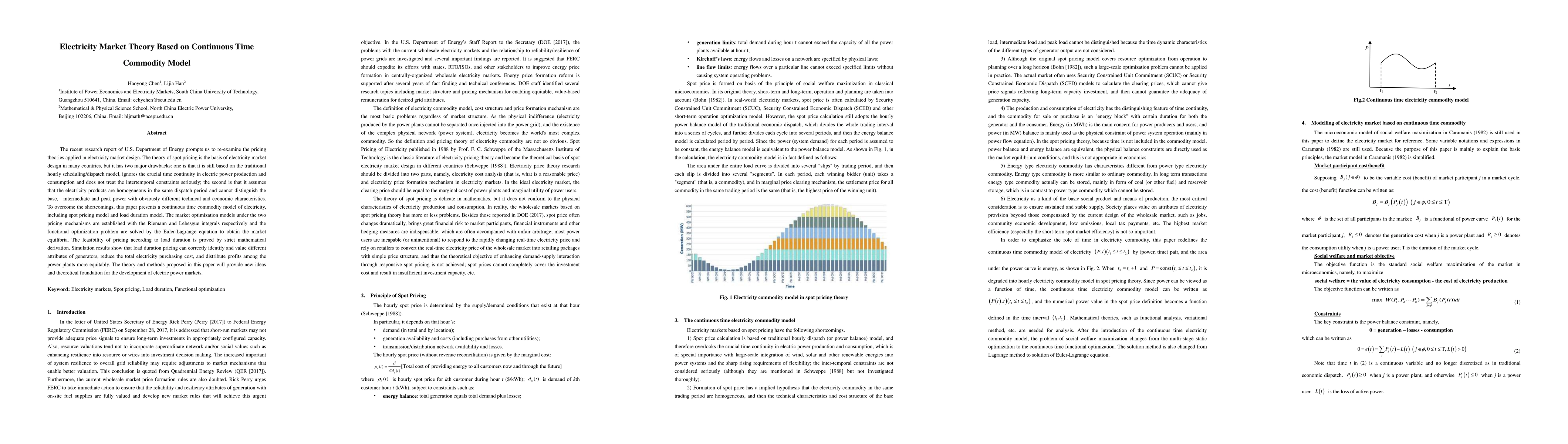 The recent research report of U.S. Department of Energy prompts us to re-examine the pricing theories applied in electricity market design. The theory of spot pricing is the basis of electricity market design in many countries, but it has two major drawbacks: one is that it is still based on the traditional hourly scheduling/dispatch model, ignores the crucial time continuity in electric power production and consumption and does not treat the inter-temporal constraints seriously; the second is that it assumes that the electricity products are homogeneous in the same dispatch period and cannot distinguish the base, intermediate and peak power with obviously different technical and economic characteristics. To overcome the shortcomings, this paper presents a continuous time commodity model of electricity, including spot pricing model and load duration model. The market optimization models under the two pricing mechanisms are established with the Riemann and Lebesgue integrals respectively and the functional optimization problem are solved by the Euler-Lagrange equation to obtain the market equilibria. The feasibility of pricing according to load duration is proved by strict mathematical derivation. Simulation results show that load duration pricing can correctly identify and value different attributes of generators, reduce the total electricity purchasing cost, and distribute profits among the power plants more equitably. The theory and methods proposed in this paper will provide new ideas and theoretical foundation for the development of electric power markets.