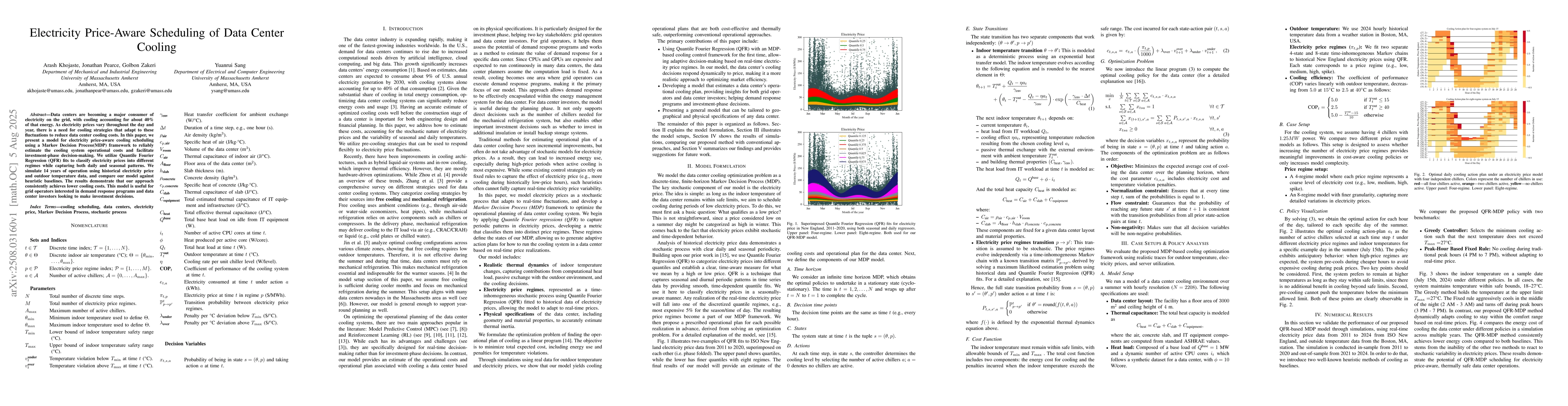 This work is the first to combine Quantile Fourier Regression with an MDP framework for cooling control, allowing dynamic responses to stochastic electricity price variations while maintaining thermal safety and cost efficiency.