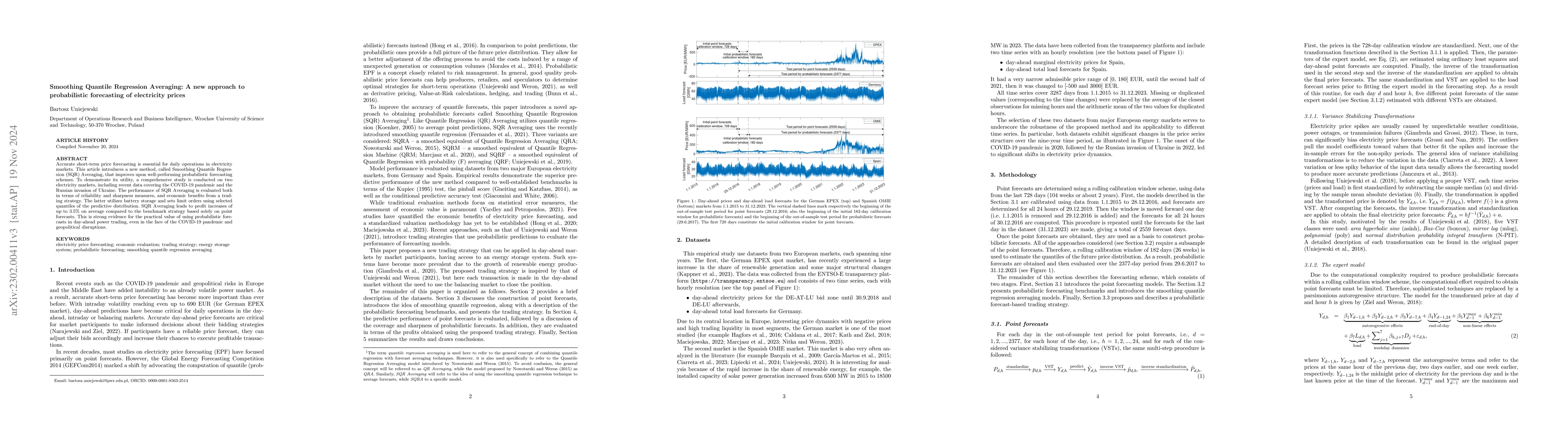 In the world of the complex power market, accurate electricity price forecasting is essential for strategic bidding and affects both daily operations and long-term investments. This article introduce a new method dubbed Smoothing Quantile Regression (SQR) Averaging, that improves on well-performing schemes for probabilistic forecasting. To showcase its utility, a comprehensive study is conducted across four power markets, including recent data encompassing the COVID-19 pandemic and the Russian invasion on Ukraine. The performance of SQR Averaging is evaluated and compared to state-of-the-art benchmark methods in terms of the reliability and sharpness measures. Additionally, an evaluation scheme is introduced to quantify the economic benefits derived from SQR Averaging predictions. This scheme can be applied in any day-ahead electricity market and is based on a trading strategy that leverages battery storage and sets limit orders using selected quantiles of the predictive distribution. The results reveal that, compared to the benchmark strategy, utilizing SQR Averaging leads to average profit increases of up to 14\%. These findings provide strong evidence for the effectiveness of SQR Averaging in improving forecast accuracy and the practical value of utilizing probabilistic forecasts in day-ahead electricity trading, even in the face of challenging events such as the COVID-19 pandemic and geopolitical disruptions.