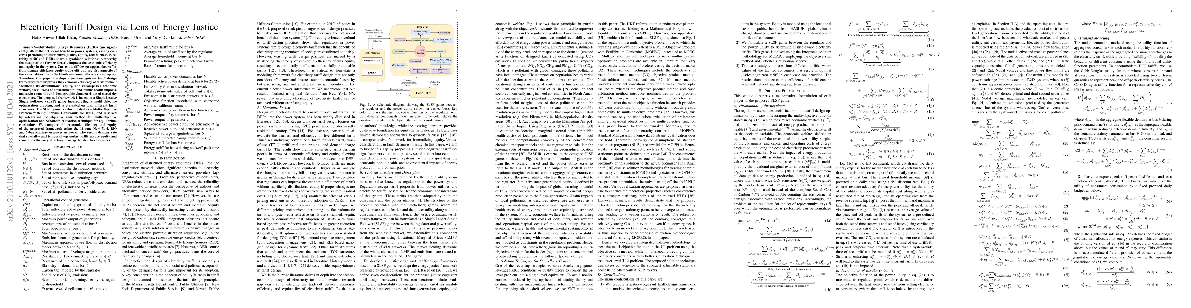 A new tariff design framework prioritizes energy justice by optimizing economic efficiency while maintaining distributional equity, using a multi-objective optimization problem with equilibrium constraints to balance environmental, social, and demographic impacts on electricity consumers.