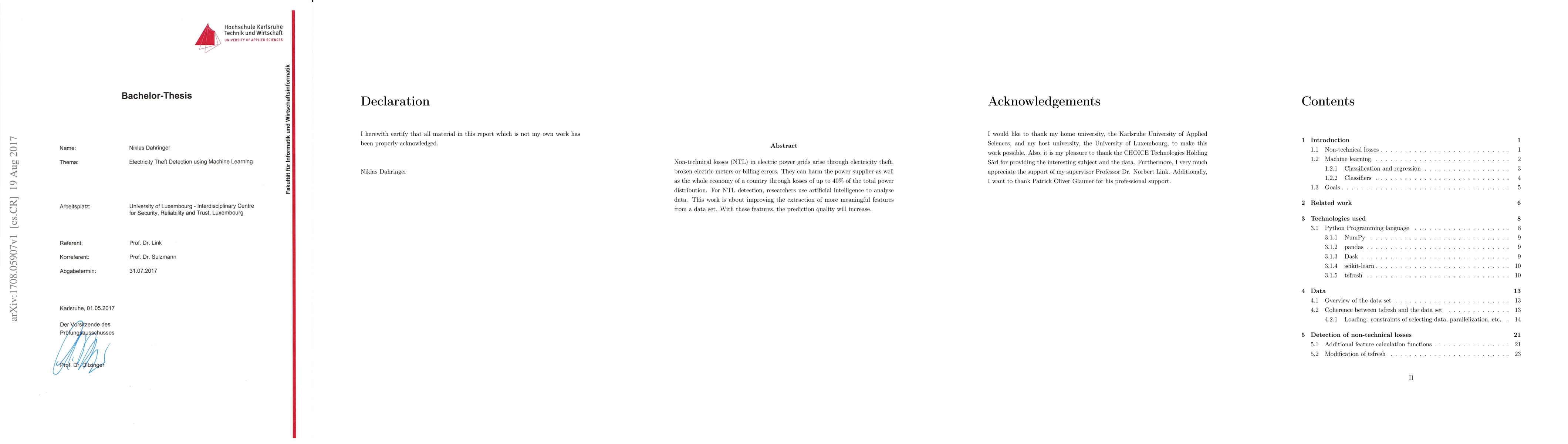 Non-technical losses (NTL) in electric power grids arise through electricity theft, broken electric meters or billing errors. They can harm the power supplier as well as the whole economy of a country through losses of up to 40% of the total power distribution. For NTL detection, researchers use artificial intelligence to analyse data. This work is about improving the extraction of more meaningful features from a data set. With these features, the prediction quality will increase.