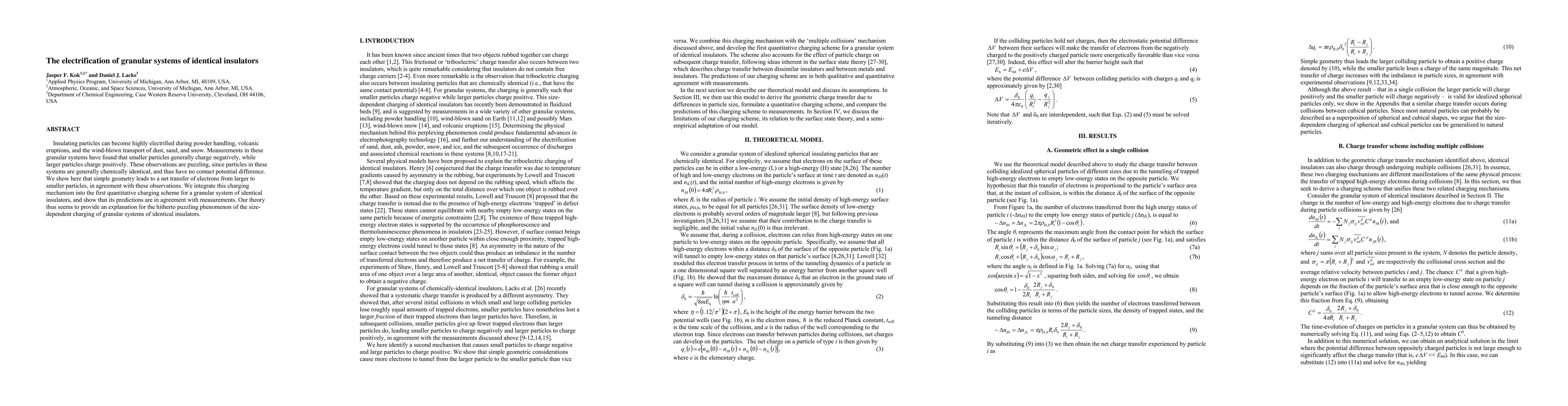 This research elucidates the size-dependent charging phenomenon in granular systems of chemically identical insulators, attributing it to geometric factors causing electrons to transfer from larger to smaller particles. The proposed quantitative charging scheme aligns with empirical observations and offers an explanation for the previously puzzling charge distribution in such systems.