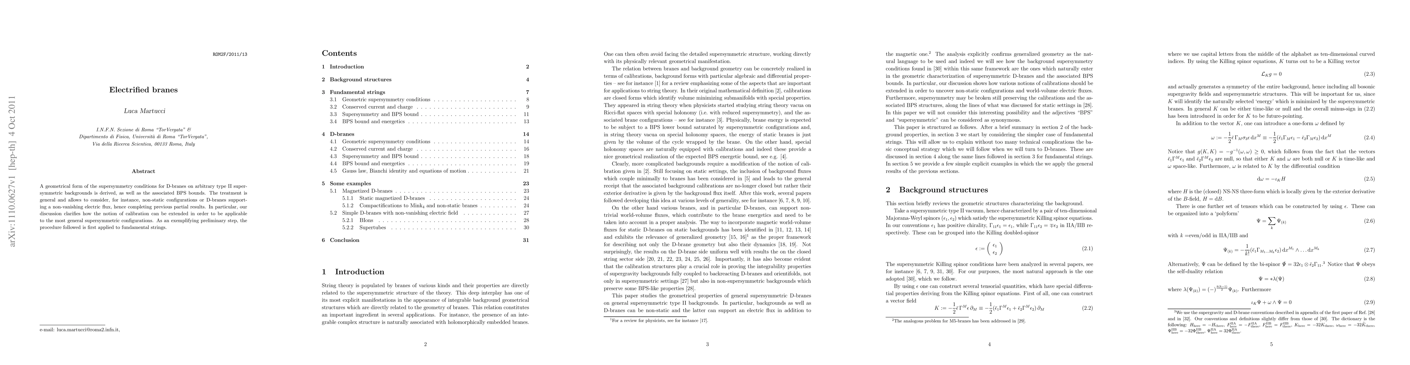 A geometrical form of the supersymmetry conditions for D-branes on arbitrary type II supersymmetric backgrounds is derived, as well as the associated BPS bounds. The treatment is general and allows to consider, for instance, non-static configurations or D-branes supporting a non-vanishing electric flux, hence completing previous partial results. In particular, our discussion clarifies how the notion of calibration can be extended in order to be applicable to the most general supersymmetric configurations. As an exemplifying preliminary step, the procedure followed is first applied to fundamental strings.