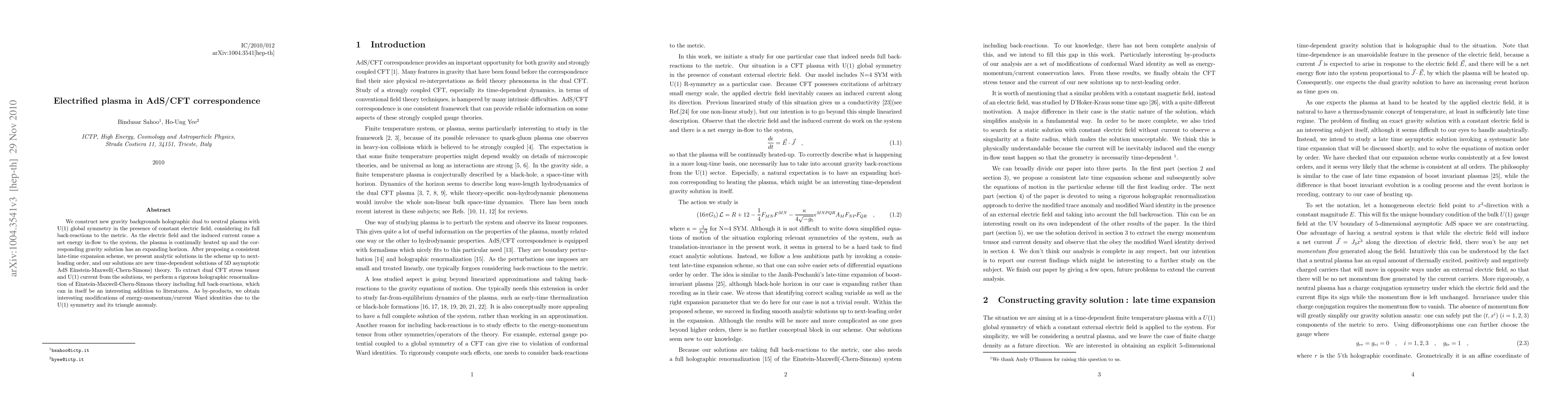 Researchers created a new gravity background that mimics electrically charged plasma in 5D AdS/CFT correspondence, with expanding horizons and modifications to energy-momentum laws due to U(1) symmetry.