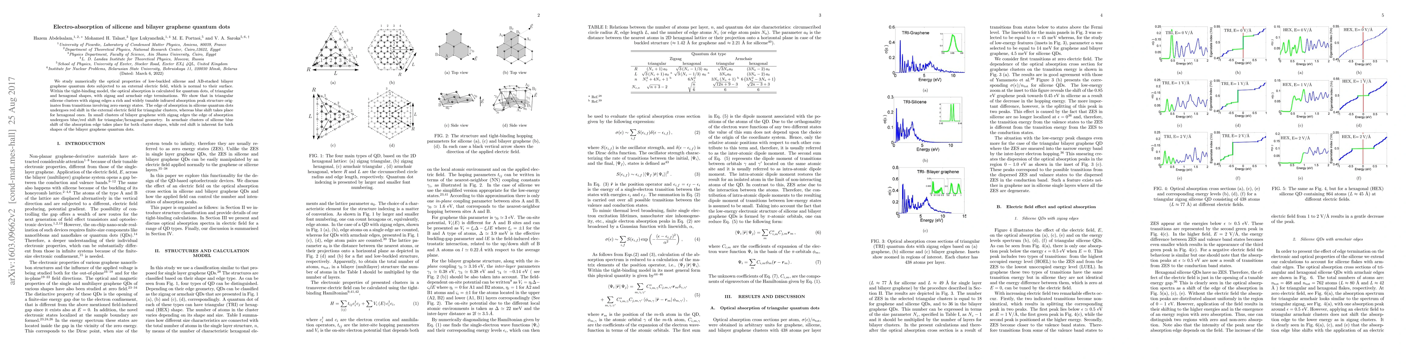 This study numerically investigates the optical properties of low-buckled silicene and bilayer graphene quantum dots under an external electric field. It finds that silicene triangular quantum dots with zigzag edges exhibit tunable infrared absorption due to zero energy state transitions, while the absorption edge shifts red in triangular and blue in hexagonal shapes under an electric field.