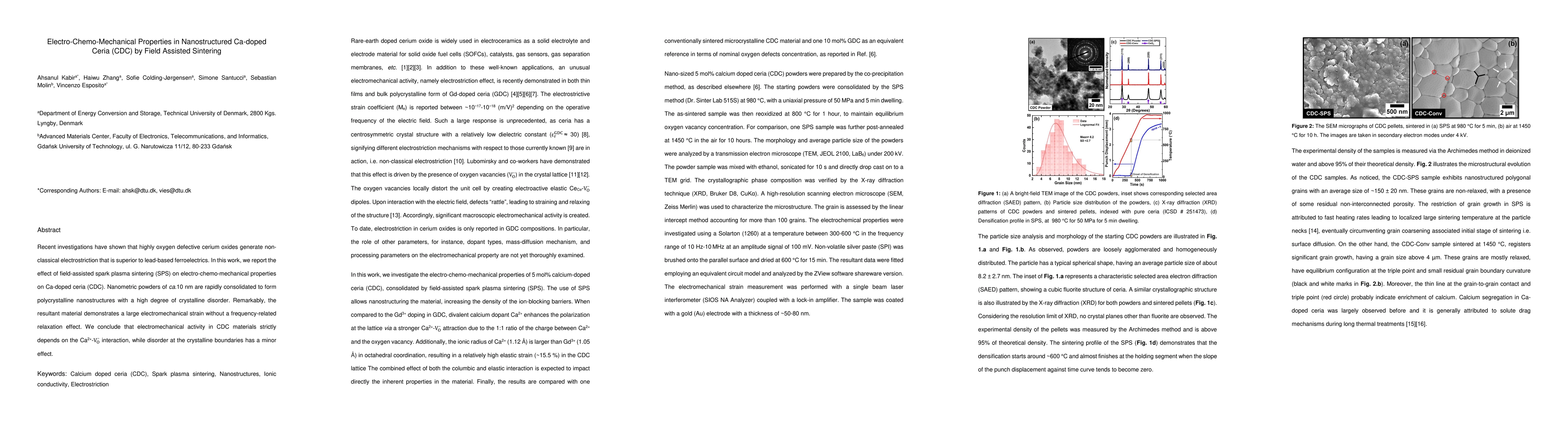 This study investigates the electro-chemo-mechanical properties of Ca-doped ceria (CDC) consolidated via field-assisted spark plasma sintering (SPS). The resultant nanostructured CDC exhibits significant electromechanical strain, highlighting the importance of Ca-VO interactions for its performance.
