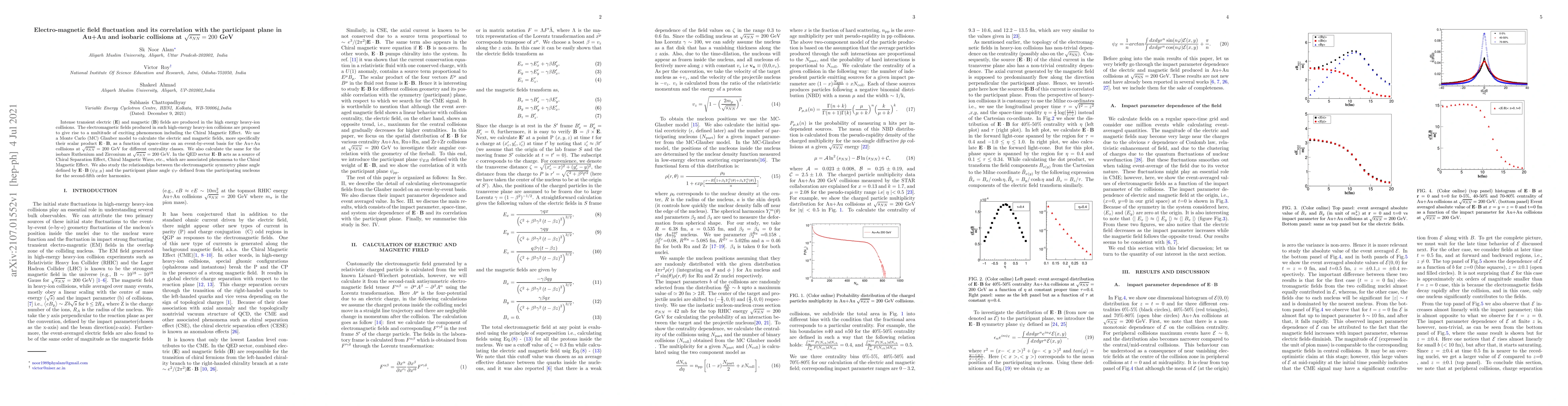 Intense transient electric ({\bf E}) and magnetic ({\bf B}) fields are produced in the high energy heavy-ion collisions. The electromagnetic fields produced in such high-energy heavy-ion collisions are proposed to give rise to a multitude of exciting phenomenon including the Chiral Magnetic Effect. We use a Monte Carlo (MC) Glauber model to calculate the electric and magnetic fields, more specifically their scalar product $\bf{E}\cdot\bf{B}$, as a function of space-time on an event-by-event basis for the Au+Au collisions at $\sqrt{s_{NN}}=200$ GeV for different centrality classes. We also calculate the same for the isobars Ruthenium and Zirconium at $\sqrt{s_{NN}}=200$ GeV. In the QED sector $\bf{E}\cdot\bf{B}$ acts as a source of Chiral Separation Effect, Chiral Magnetic Wave, etc., which are associated phenomena to the Chiral Magnetic Effect. We also study the relationships between the electromagnetic symmetry plane angle defined by $\bf{E}\cdot\bf{B}$ ($\psi_{E.B}$) and the participant plane angle $\psi_{P}$ defined from the participating nucleons for the second-fifth order harmonics.