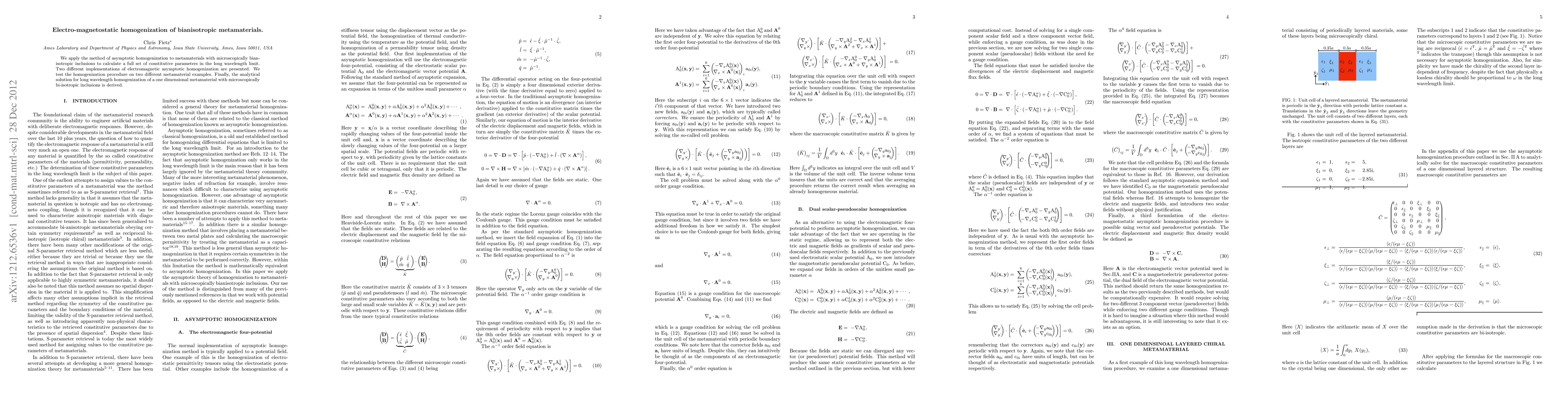 This paper develops a method for asymptotic homogenization to determine the constitutive parameters of bianisotropic metamaterials, comparing two implementations and validating them with examples. It also derives an analytical solution for long wavelength homogenization of one-dimensional metamaterials with bi-isotropic inclusions.