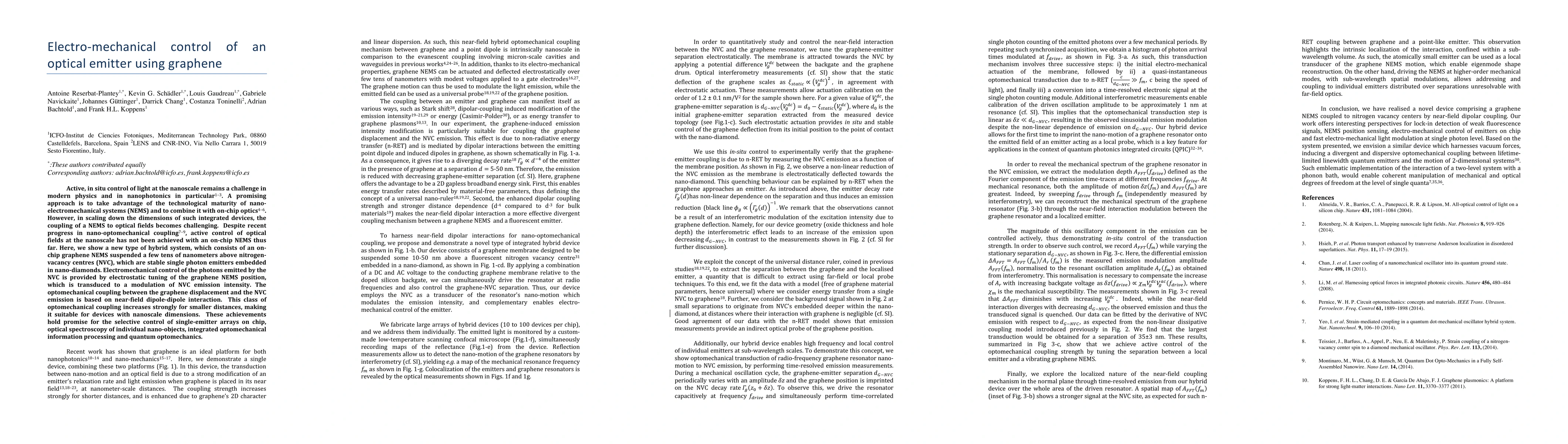 This paper presents a hybrid system combining graphene nano-electromechanical systems (NEMS) with nitrogen-vacancy centres for nanoscale light control, demonstrating electromechanical modulation of single photon emission through electrostatic tuning. This optomechanical coupling, enhanced by near-field dipole-dipole interactions, opens new avenues for on-chip single-emitter control and quantum optomechanics.