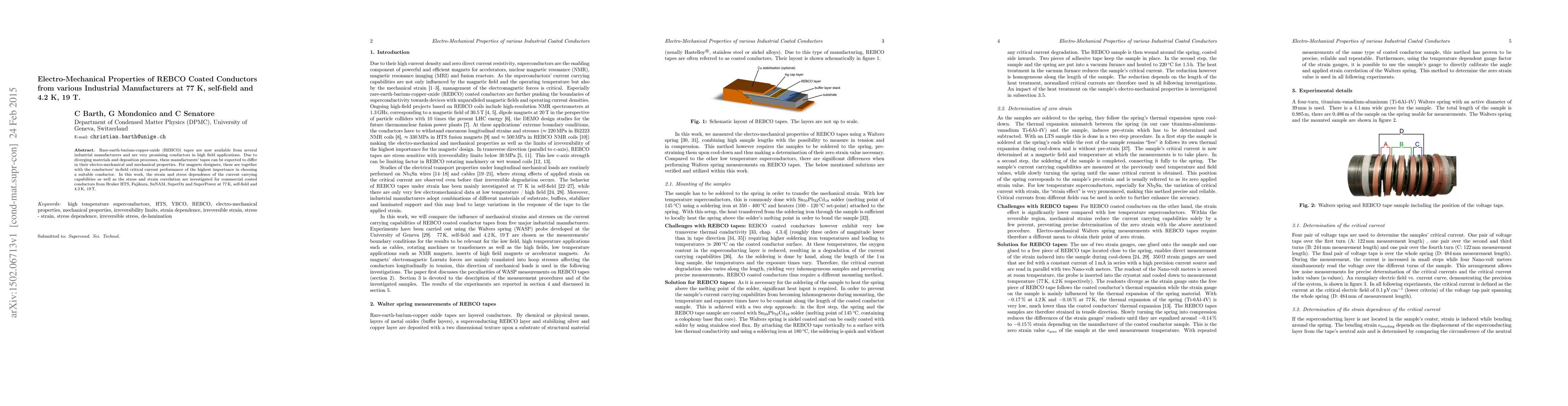 This study investigates the electro-mechanical properties of REBCO coated conductors from five industrial manufacturers, focusing on their strain and stress dependence under self-field at 77 K and 19 T at 4.2 K. The research aims to compare the critical current performance and mechanical properties to aid magnet designers in selecting appropriate conductors.