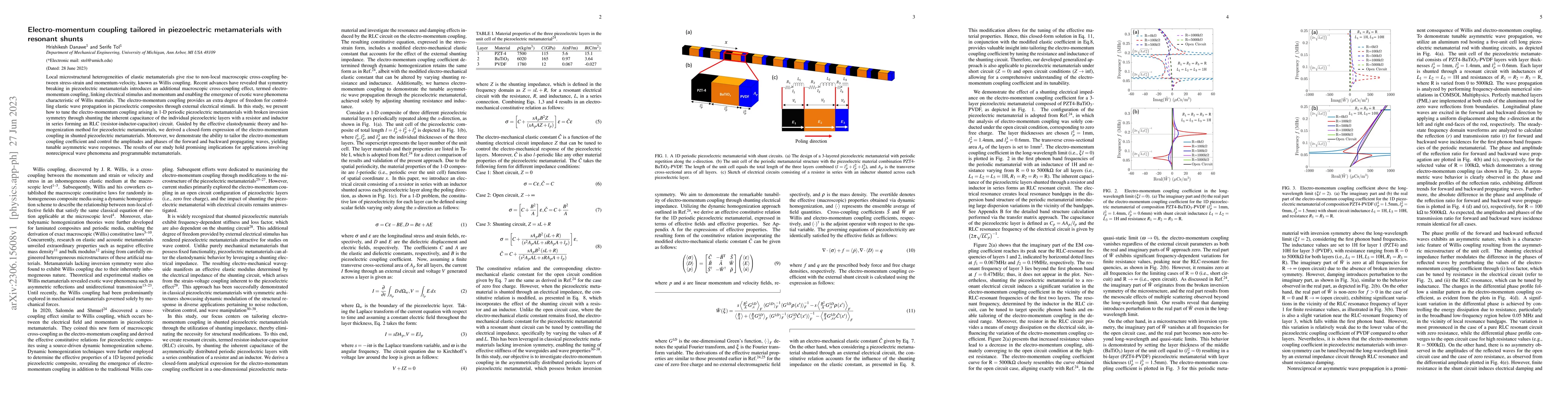 This paper investigates electro-momentum coupling in piezoelectric metamaterials with resonant shunts, demonstrating how to tune this coupling through an RLC circuit to control wave propagation. The study provides a closed-form expression for the coupling and shows tunable asymmetric wave responses, promising applications in nonreciprocal wave phenomena and programmable metamaterials.