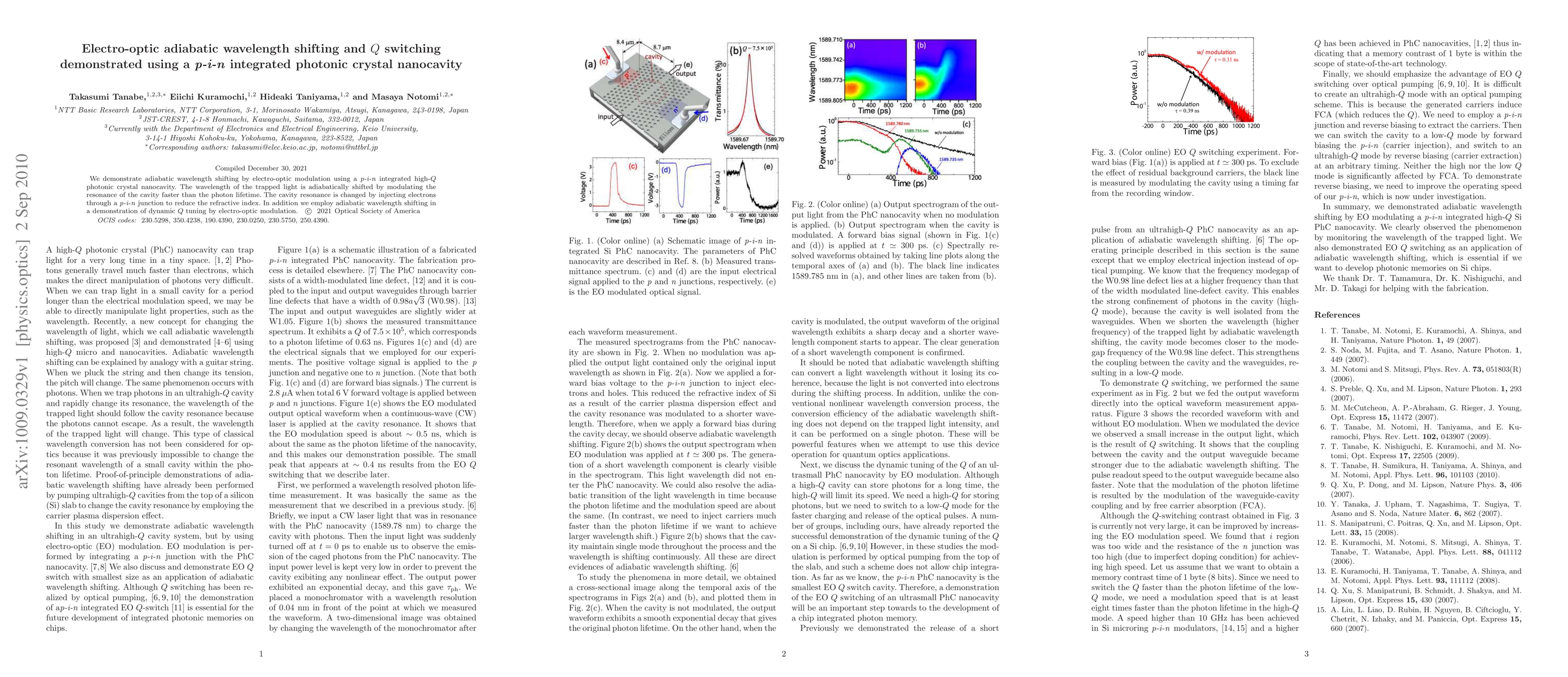 This paper demonstrates adiabatic wavelength shifting and Q switching in a p-i-n integrated photonic crystal nanocavity using electro-optic modulation. The cavity resonance is dynamically tuned by modulating the refractive index via electron injection, allowing for precise control of trapped light wavelengths.