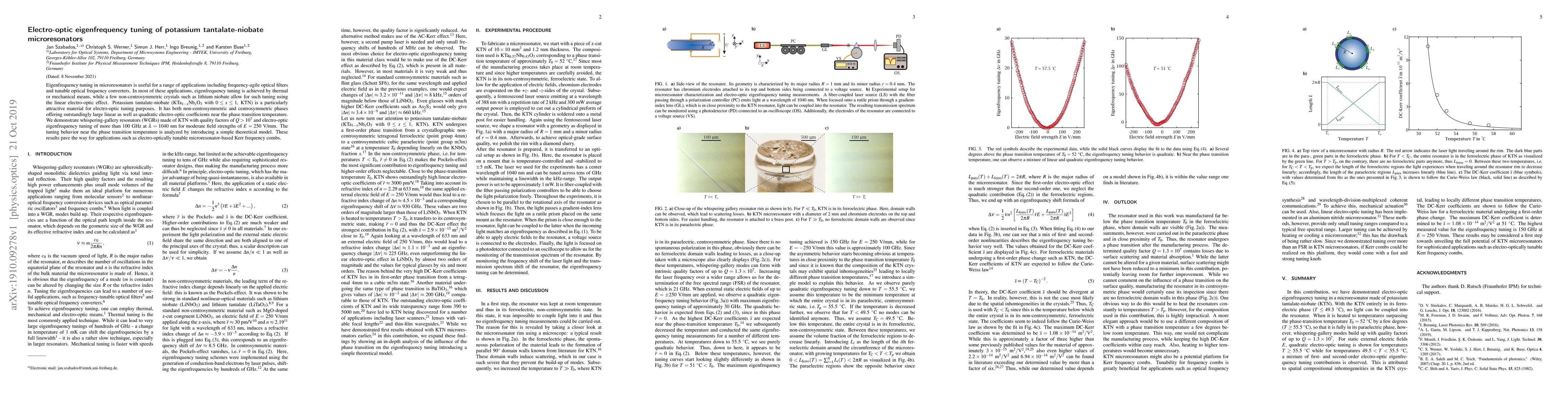 This research demonstrates electro-optic eigenfrequency tuning in potassium tantalate-niobate (KTN) microresonators, achieving over 100 GHz tuning at 1040 nm using moderate electric fields. The study highlights KTN's potential for applications in tunable optical systems due to its large electro-optic coefficients near phase transition temperatures.
