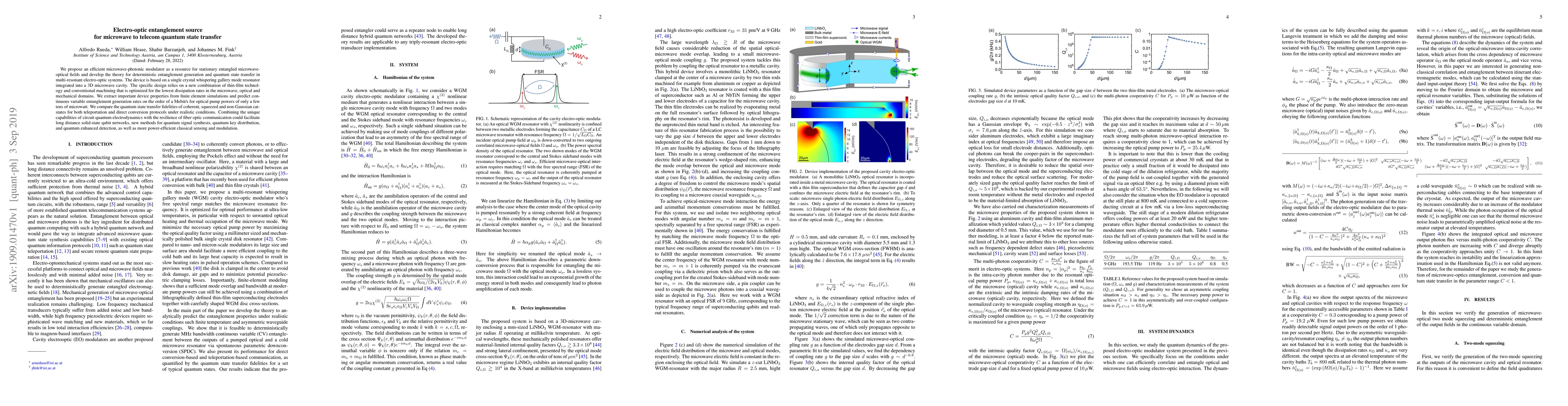 We propose an efficient microwave-photonic modulator as a resource for stationary entangled microwave-optical fields and develop the theory for deterministic entanglement generation and quantum state transfer in multi-resonant electro-optic systems. The device is based on a single crystal whispering gallery mode resonator integrated into a 3D microwave cavity. The specific design relies on a new combination of thin-film technology and conventional machining that is optimized for the lowest dissipation rates in the microwave, optical and mechanical domains. We extract important device properties from finite element simulations and predict continuous variable entanglement generation rates on the order of a Mebit/s for optical pump powers of only a few tens of microwatt. We compare the quantum state transfer fidelities of coherent, squeezed and non-Gaussian cat-states for both teleportation and direct conversion protocols under realistic conditions. Combining the unique capabilities of circuit quantum electrodynamics with the resilience of fiber optic communication could facilitate long distance solid-state qubit networks, new methods for quantum signal synthesis, quantum key distribution, and quantum enhanced detection, as well as more power-efficient classical sensing and modulation.