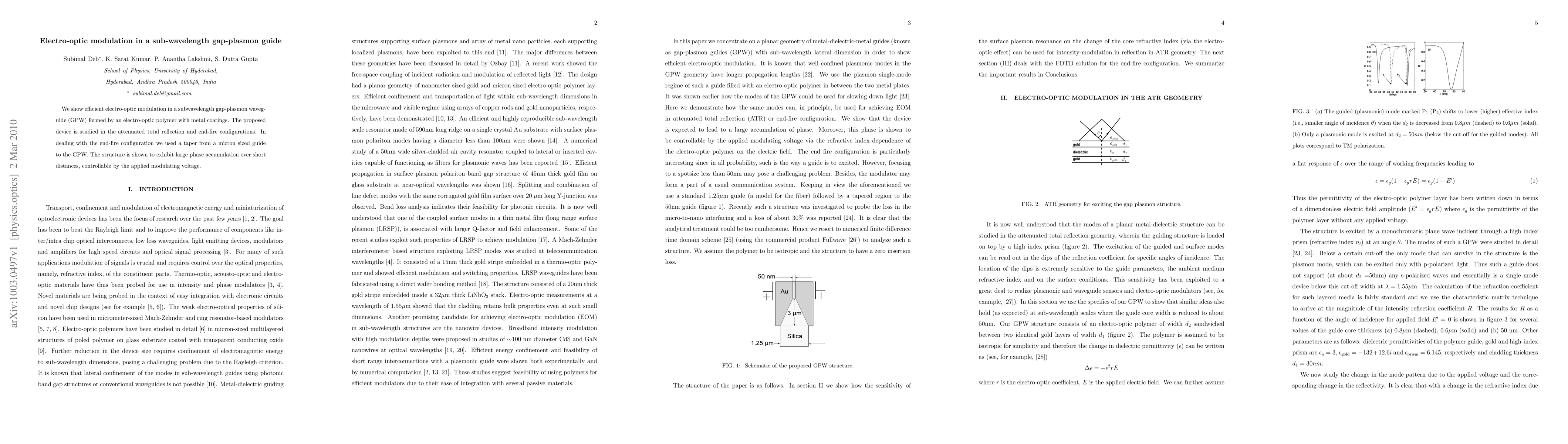 We show efficient electro-optic modulation in a subwavelength gap-plasmon waveguide (GPW) formed by an electro-optic polymer with metal coatings. The proposed device is studied in the attenuated total reflection and end-fire configurations. In dealing with the end-fire configuration we used a taper from a micron sized guide to the GPW. The structure is shown to exhibit large phase accumulation over short distances, controllable by the applied modulating voltage.