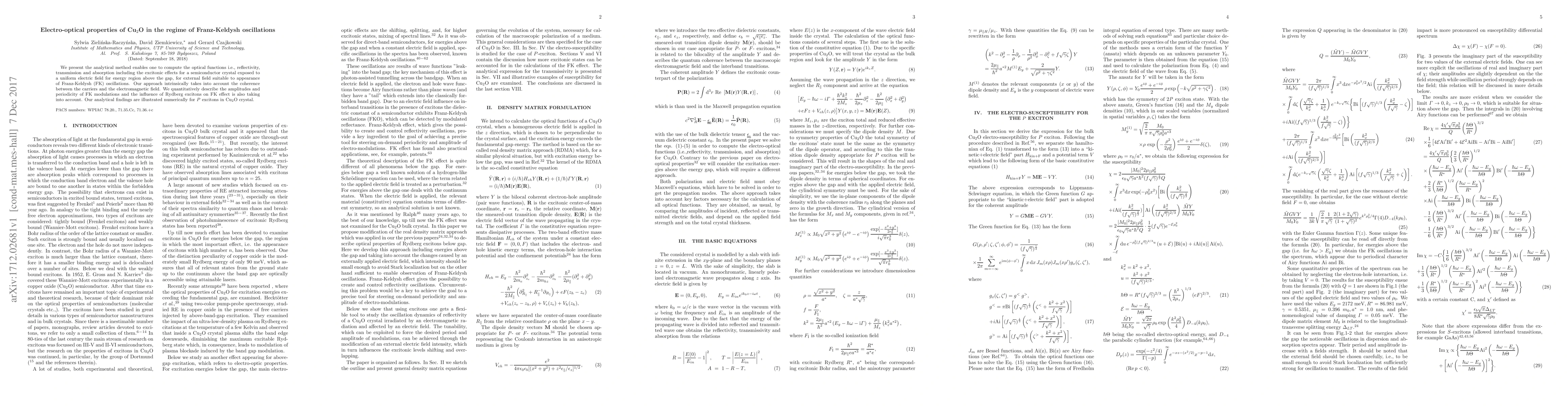 We present the analytical method enables one to compute the optical functions i.e., reflectivity, transmission and absorption including the excitonic effects for a semiconductor crystal exposed to a uniform electric field for energy region above the gap, for external field suitable to appearance of Franz-Keldysh (FK) oscillations. Our approach intrinsically takes into account the coherence between the carriers and the electromagnetic field. We quantitatively describe the amplitudes and periodicity of FK modulations and the influence of Rydberg excitons on FK effect is also taking into account. Our analytical findings are illustrated numerically for $P$ excitons in Cu$_2$O crystal.
