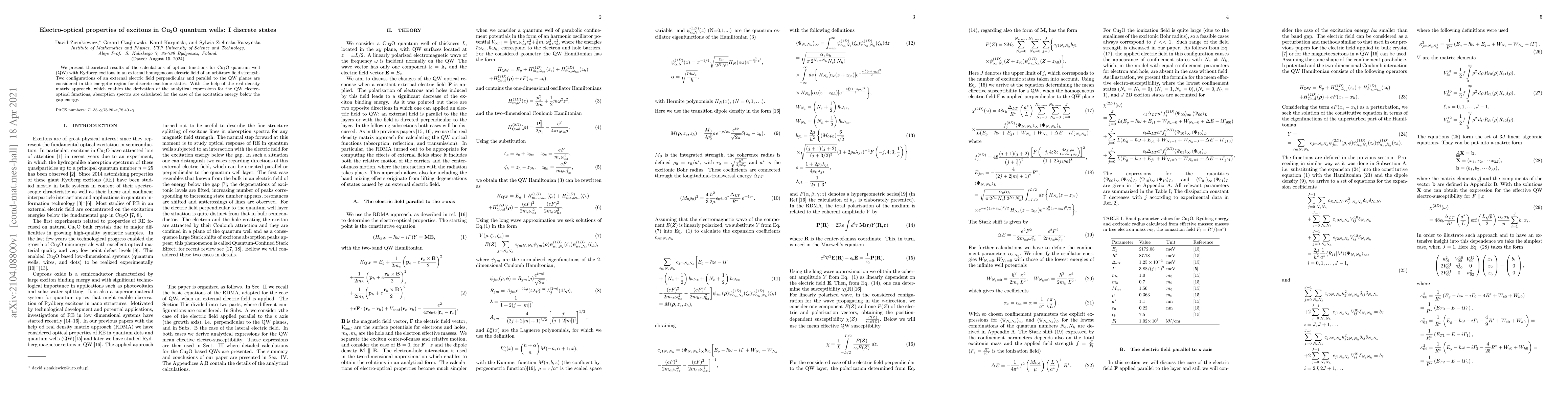 This paper theoretically investigates the optical functions of Cu$_2$O quantum wells with Rydberg excitons under an external electric field, considering both perpendicular and parallel field orientations. Using the real density matrix approach, it derives analytical expressions for the electro-optical functions and calculates absorption spectra for excitation energies below the gap energy.