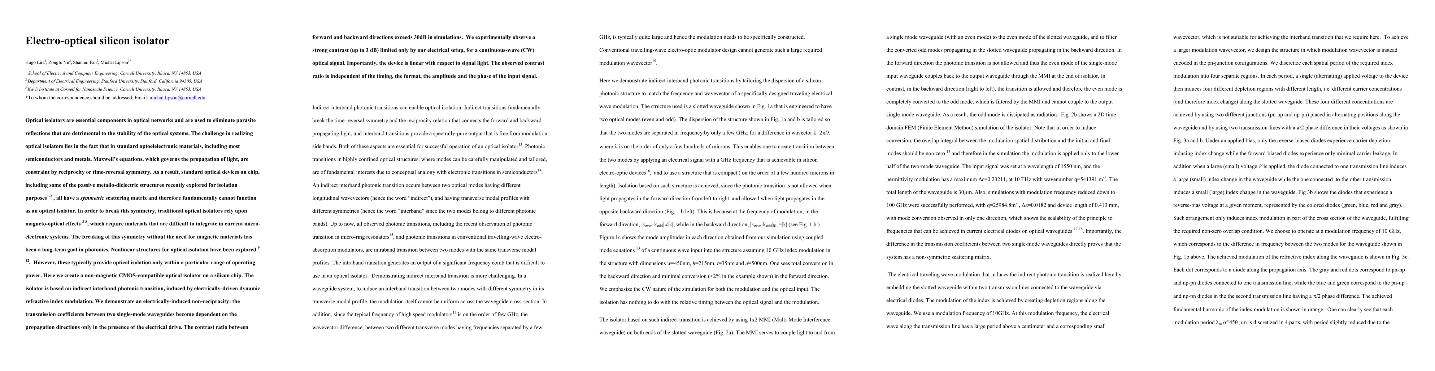 This research develops a CMOS-compatible electro-optical silicon isolator that utilizes dynamic refractive index modulation to achieve non-reciprocal optical transmission. The device demonstrates a high contrast ratio of over 30dB in simulations and up to 3dB experimentally, showing linear response to input optical signals.