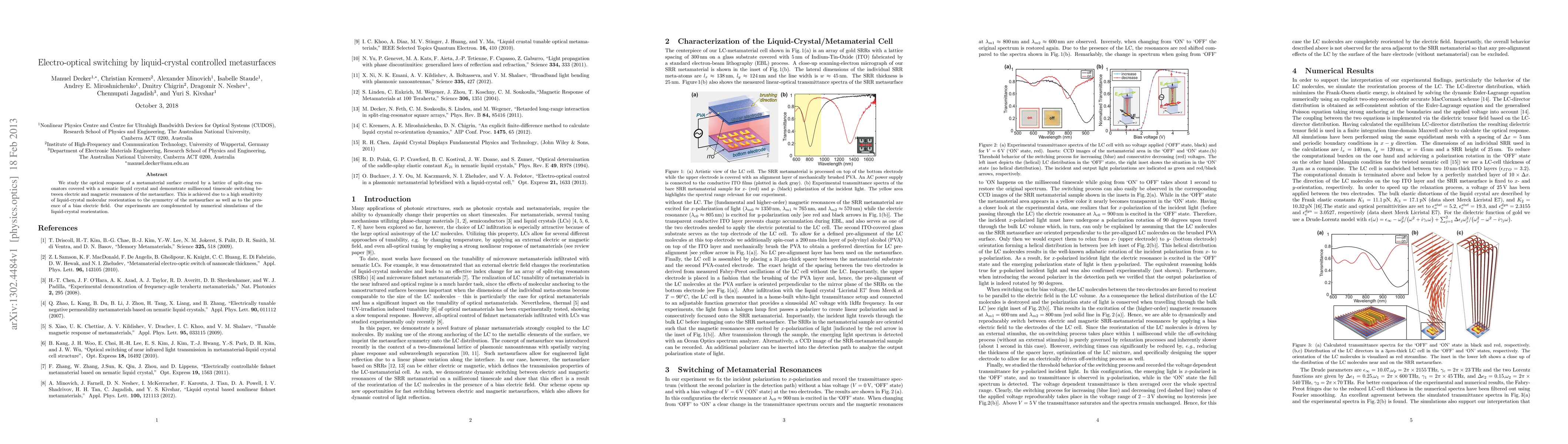 This paper explores a metamaterial surface with split-ring resonators covered by nematic liquid crystal, demonstrating millisecond-scale electro-optical switching between electric and magnetic resonances, driven by liquid-crystal reorientation sensitivity to the metasurface's symmetry and an applied electric field. Numerical simulations support the experimental findings.