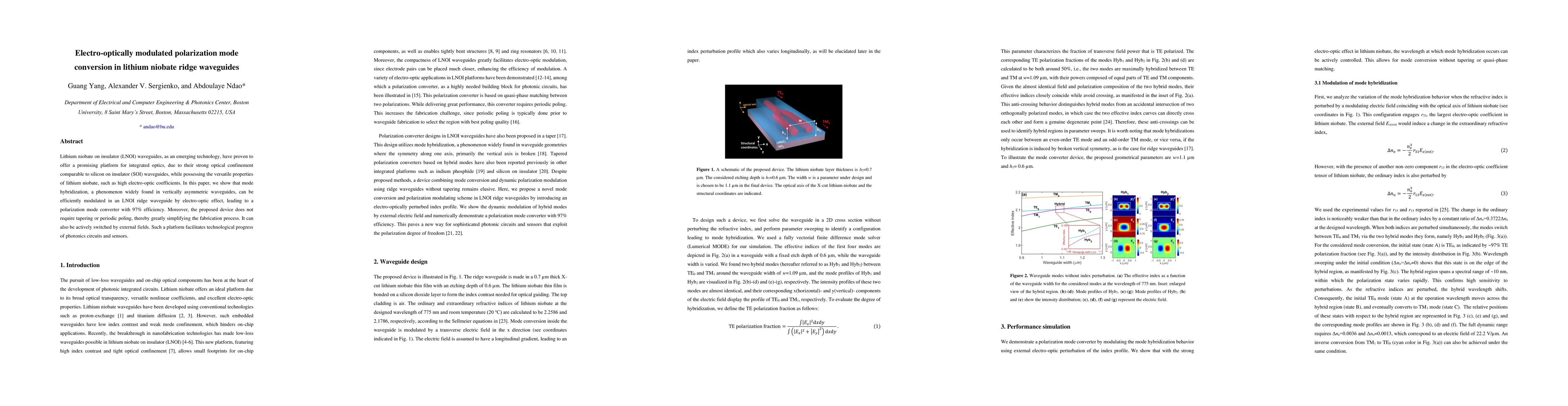 This paper demonstrates an electro-optically modulated polarization mode converter in lithium niobate on insulator ridge waveguides, achieving 97% efficiency. The device simplifies fabrication and allows active switching, advancing integrated photonics.