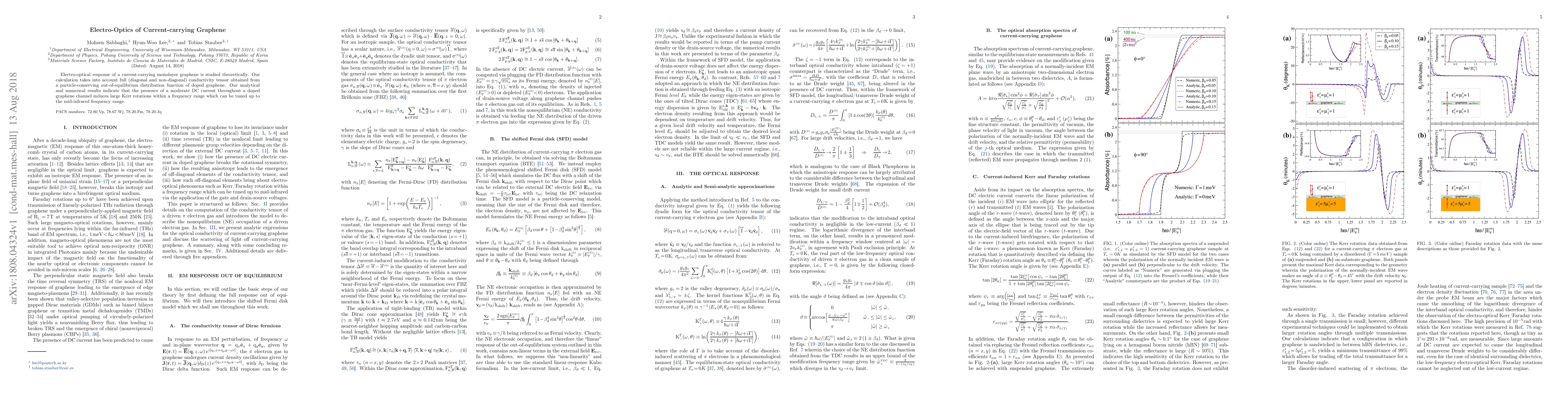 This paper investigates the electro-optical response of doped, current-carrying graphene, revealing significant Kerr rotations inducible by moderate DC currents, with tunability extending into the mid-infrared frequency range. The findings are derived from a comprehensive conductivity tensor analysis based on out-of-equilibrium distribution functions.