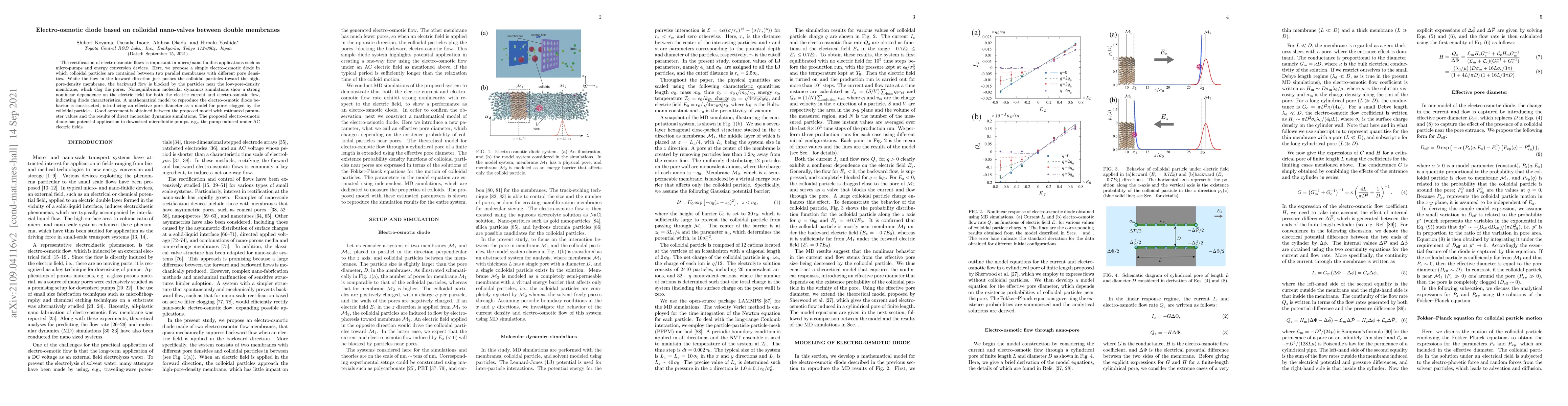 This paper proposes an electro-osmotic diode using colloidal nano-valves between double membranes with different pore densities, demonstrating rectification of fluid flow under electric fields. The diode's behavior is validated through molecular dynamics simulations and a mathematical model, showing potential for micro-pump applications.
