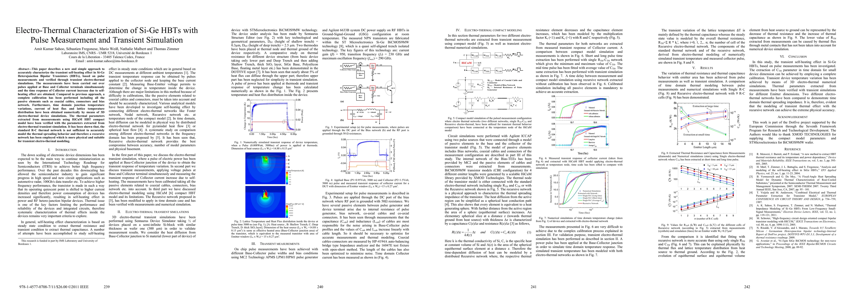 This paper presents a novel method for characterizing transient self-heating in Si-Ge HBTs using pulse measurements and transient electro-thermal simulations, showing that a recursive thermal network model is more accurate than the standard R-C network for modeling thermal behavior.