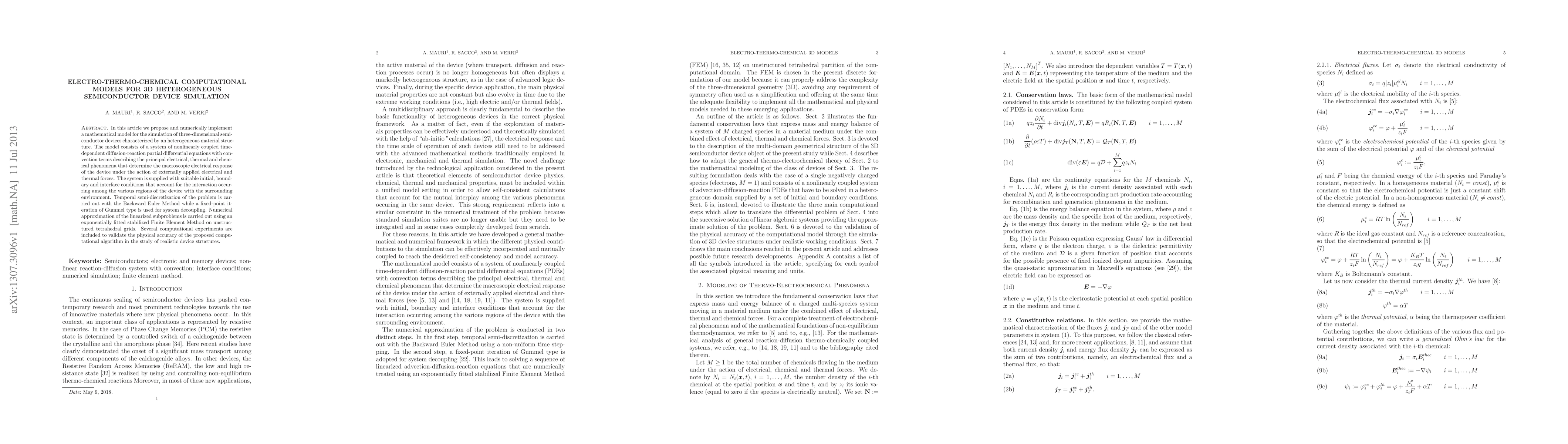 In this article we propose and numerically implement a mathematical model for the simulation of three-dimensional semiconductor devices characterized by an heterogeneous material structure. The model consists of a system of nonlinearly coupled time-dependent diffusion-reaction partial differential equations with convection terms describing the principal electrical, thermal and chemical phenomena that determine the macroscopic electrical response of the device under the action of externally applied electrical and thermal forces. The system is supplied with suitable initial, boundary and interface conditions that account for the interaction occurring among the various regions of the device with the surrounding environment. Temporal semi-discretization of the problem is carried out with the Backward Euler Method while a fixed-point iteration of Gummel type is used for system decoupling. Numerical approximation of the linearized subproblems is carried out using an exponentially fitted stabilized Finite Element Method on unstructured tetrahedral grids. Several computational experiments are included to validate the physical accuracy of the proposed computational algorithm in the study of realistic device structures.