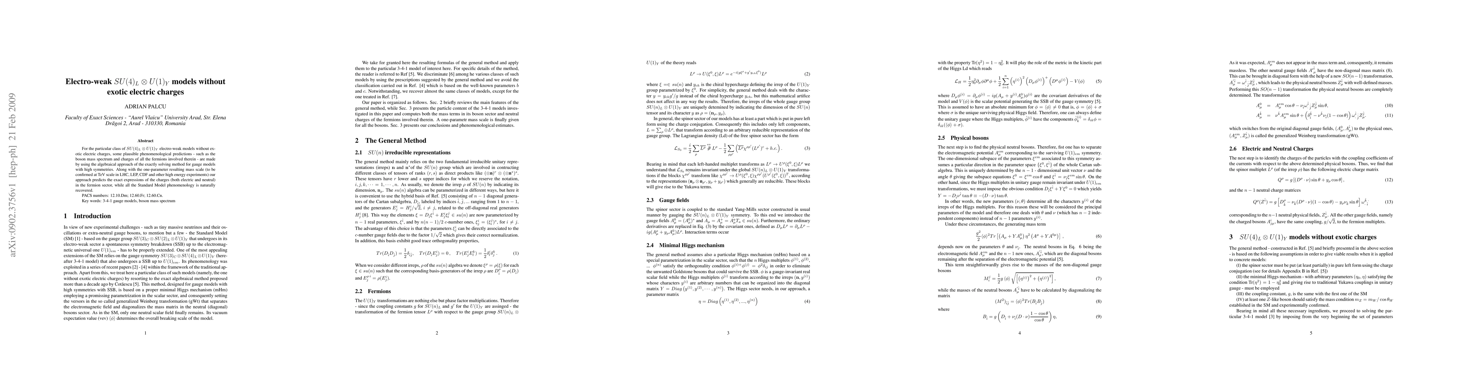 For the particular class of \textbf{$SU(4)_{L}\otimes U(1)_{Y}$} electro-weak models without exotic electric charges, some plausible phenomenological predictions - such as the boson mass spectrum and charges of all the fermions involved therein - are made by using the algebraical approach of the exactly solving method for gauge models with high symmetries. Along with the one-parameter resulting mass scale (to be confirmed at TeV scale in LHC, LEP, CDF and other high energy experiments) our approach predicts the exact expressions of the charges (both electric and neutral) in the fermion sector, while all the Standard Model phenomenology is naturally recovered.