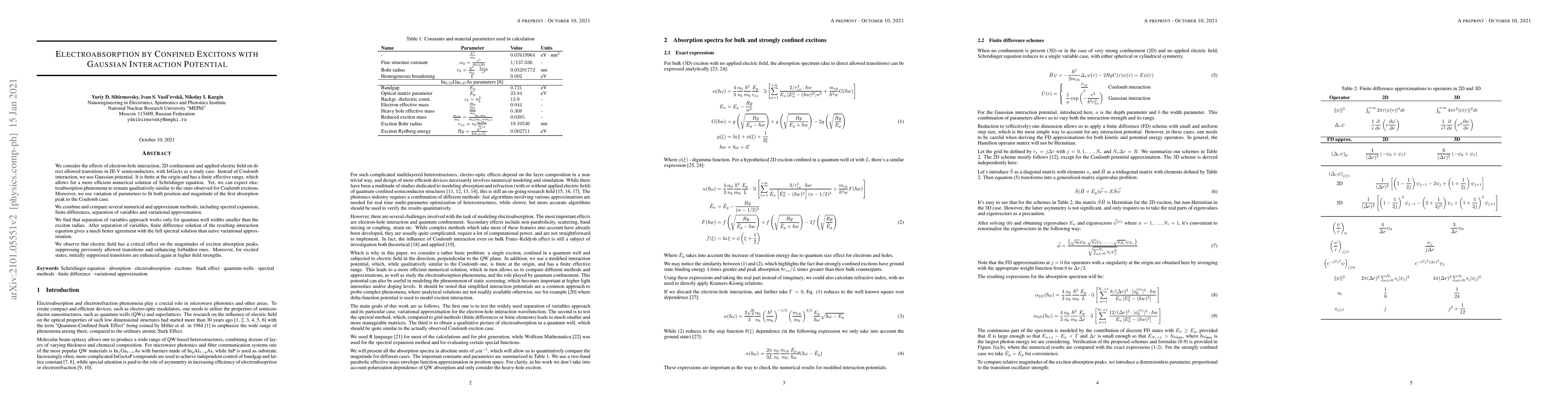 We consider the effects of electron-hole interaction, 2D confinement and applied electric field on direct allowed transitions in III-V semiconductors, with InGaAs as a study case. Instead of Coulomb interaction, we use Gaussian potential. It is finite at the origin and has a finite effective range, which allows for a more efficient numerical solution of Schr\"{o}dinger equation. Yet, we can expect electroabsorption phenomena to remain qualitatively similar to the ones observed for Coulomb excitons. Moreover, we use variation of parameters to fit both position and magnitude of the first absorption peak to the Coulomb case. We combine and compare several numerical and approximate methods, including spectral expansion, finite differences, separation of variables and variational approximation. We find that separation of variables approach works only for quantum well widths smaller than the exciton radius. After separation of variables, finite difference solution of the resulting interaction equation gives a much better agreement with the full spectral solution than naive variational approximation. We observe that electric field has a critical effect on the magnitudes of exciton absorption peaks, suppressing previously allowed transitions and enhancing forbidden ones. Moreover, for excited states, initially suppressed transitions are enhanced again at higher field strengths.