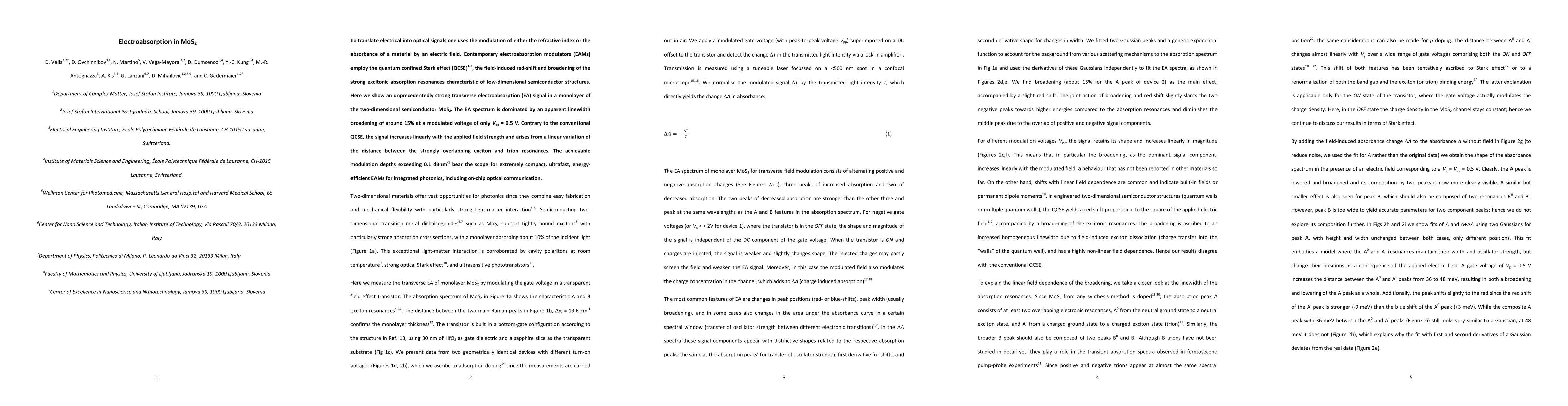 This paper reports an unprecedentedly strong transverse electroabsorption signal in monolayer MoS$_2$, demonstrating a linear increase with applied field and a modulation depth of over 0.1 dBnm$^{-1}$. This suggests potential for compact, ultrafast, and energy-efficient electroabsorption modulators for integrated photonics.