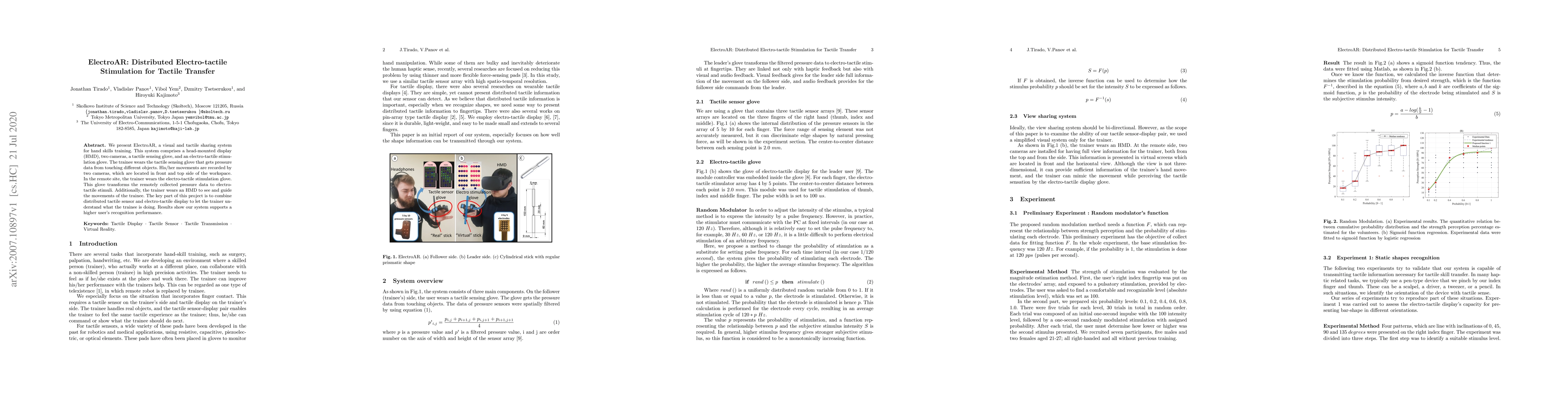 ElectroAR enables remote hand skills training by combining a tactile sensing glove and electro-tactile stimulation glove to share visual and tactile feedback between trainee and trainer, enhancing user recognition performance.