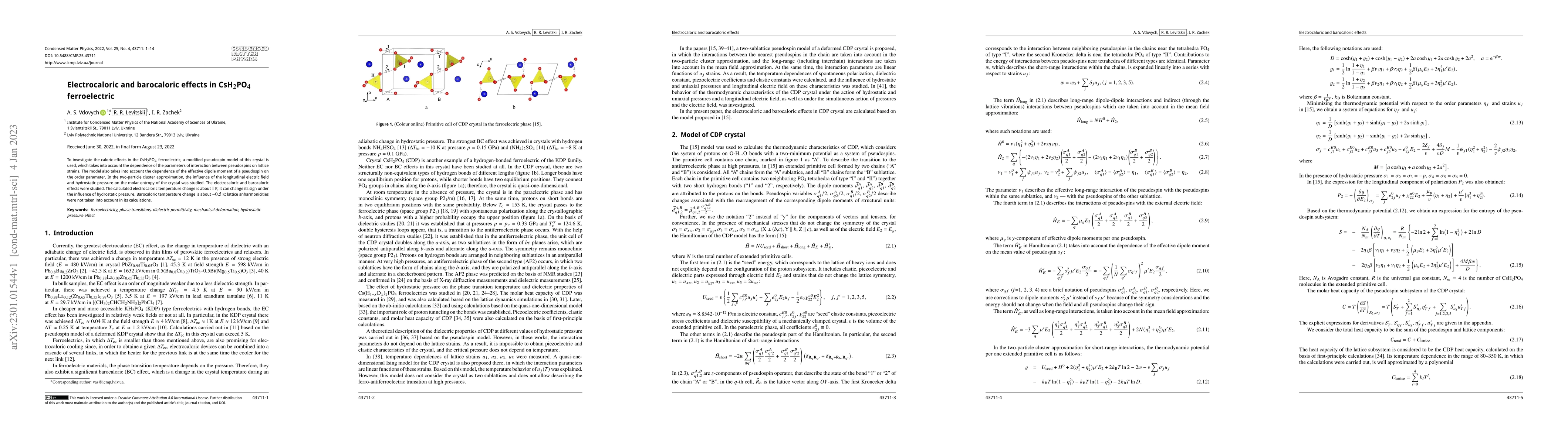 This paper investigates the electrocaloric and barocaloric effects in CsH$_2$PO$_4$ ferroelectric using a modified pseudospin model that considers lattice strains and effective dipole moments. The study finds an electrocaloric temperature change of about $1$ K, which can reverse with hydrostatic pressure, and a barocaloric temperature change of approximately $-0.5$ K, excluding lattice anharmonicities.