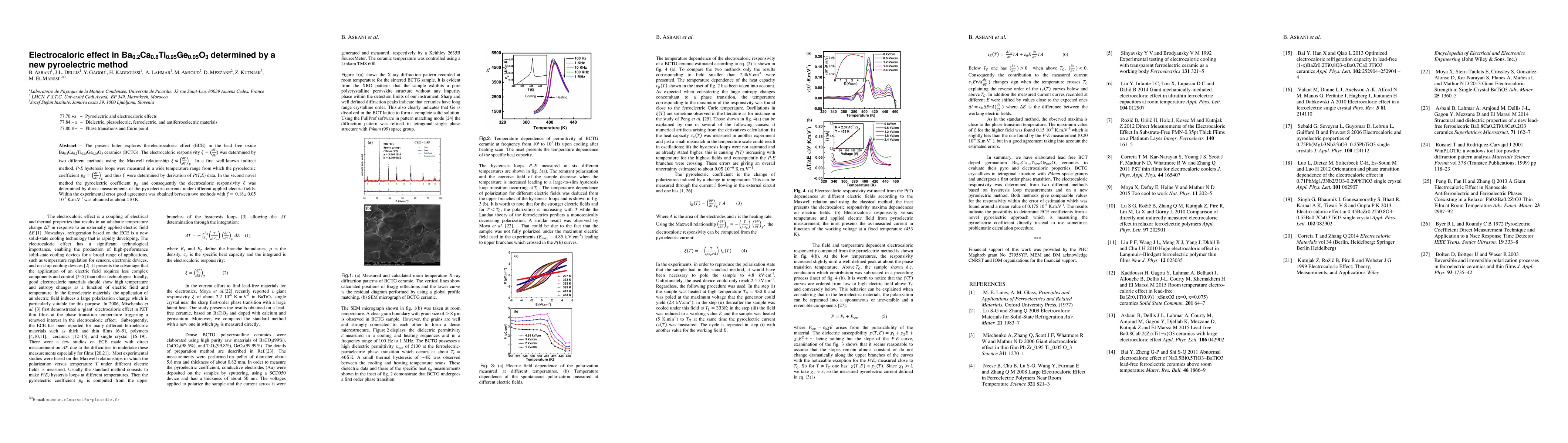 Researchers discovered an electrocaloric effect of 0.18 +/- 0.05 10^-6 K.m.V-1 in Ba(0.2)Ca(0.8)Ti(0.95)Ge(0.05)O(3) ceramics at 410K using a novel pyroelectric method.