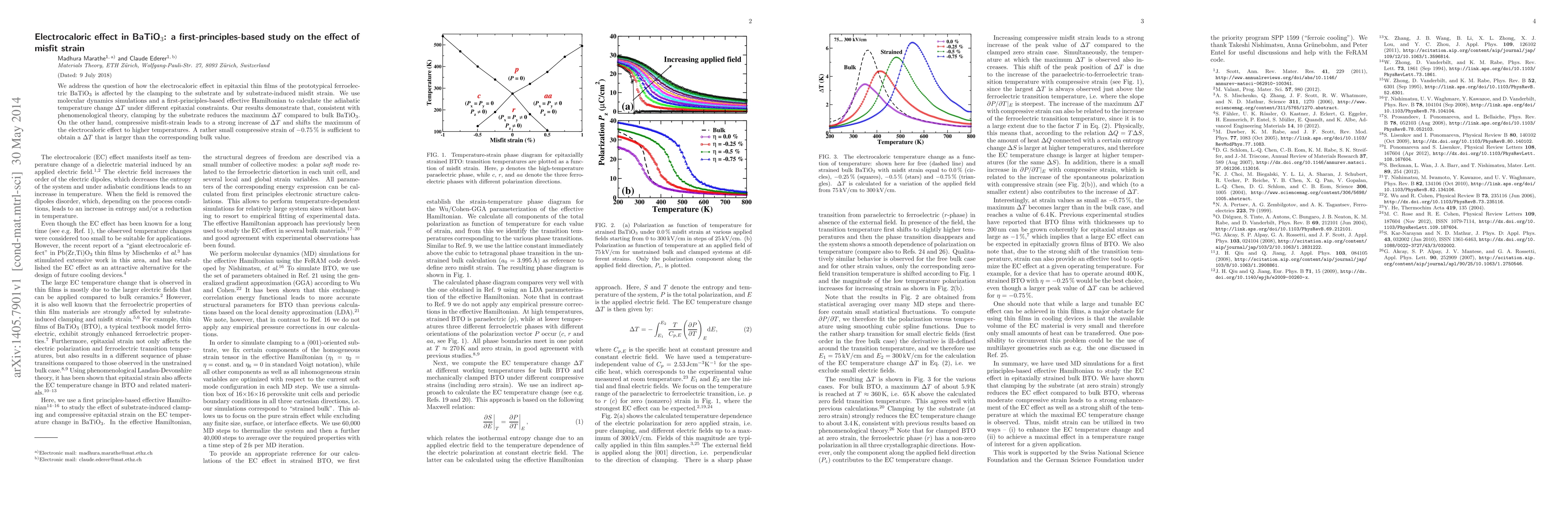 We address the question of how the electrocaloric effect in epitaxial thin films of the prototypical ferroelectric BaTiO$_3$ is affected by the clamping to the substrate and by substrate-induced misfit strain. We use molecular dynamics simulations and a first-principles-based effective Hamiltonian to calculate the adiabatic temperature change $\Delta T$ under different epitaxial constraints. Our results demonstrate that, consistent with phenomenological theory, clamping by the substrate reduces the maximum $\Delta T$ compared to bulk BaTiO$_3$. On the other hand, compressive misfit-strain leads to a strong increase of $\Delta T$ and shifts the maximum of the electrocaloric effect to higher temperatures. A rather small compressive strain of $-0.75$% is sufficient to obtain a $\Delta T$ that is larger than the corresponding bulk value.