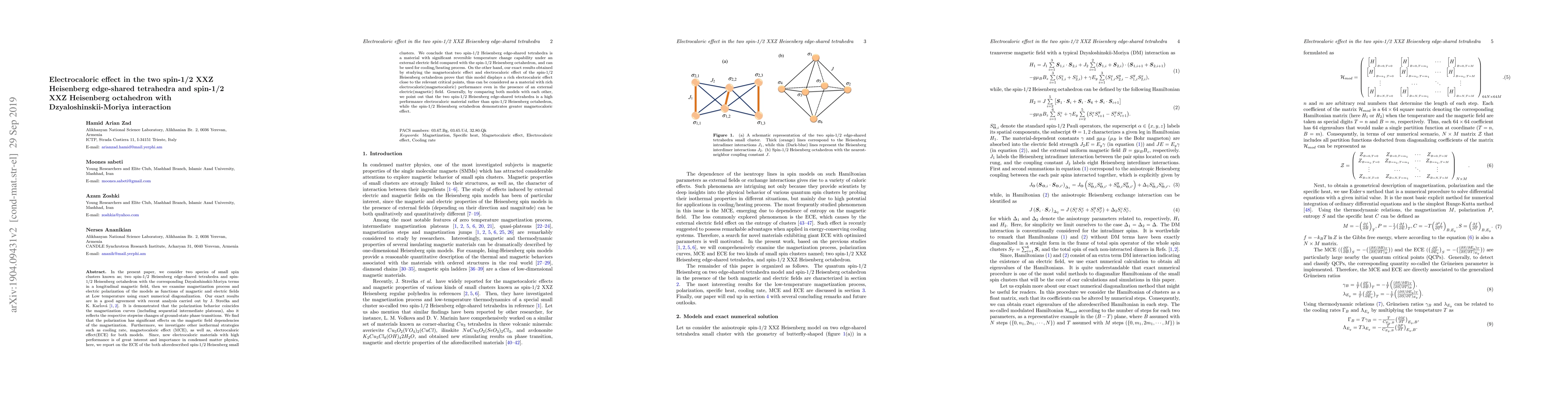 This paper investigates the electrocaloric effect (ECE) in two spin-1/2 Heisenberg clusters: edge-shared tetrahedra and octahedron with Dzyaloshinskii-Moriya interaction. The study reveals that the edge-shared tetrahedra exhibit a significant reversible temperature change under an external electric field, making it a promising candidate for cooling/heating applications.