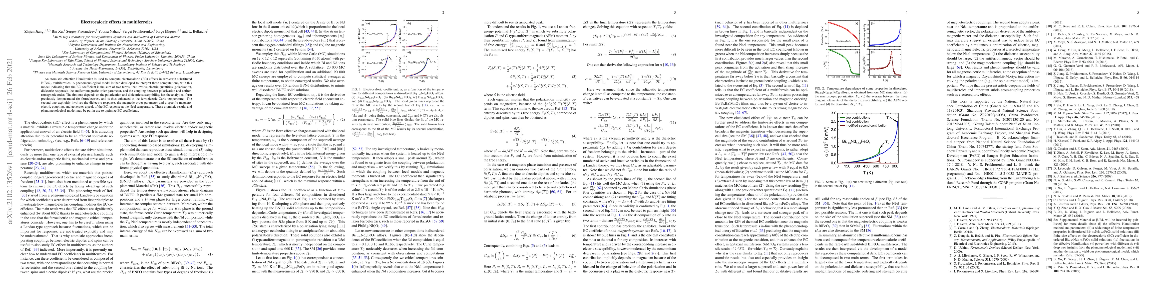 This paper investigates electrocaloric effects in rare-earth substituted BiFeO$_3$ multiferroics using an atomistic effective Hamiltonian and develops a phenomenological model. The model reveals that the EC coefficient comprises two terms, one linked to polarization and dielectric susceptibility, and another involving magnetic order and magnetoelectric coupling, each contributing distinct peaks at ferroelectric and Néel temperatures, respectively.