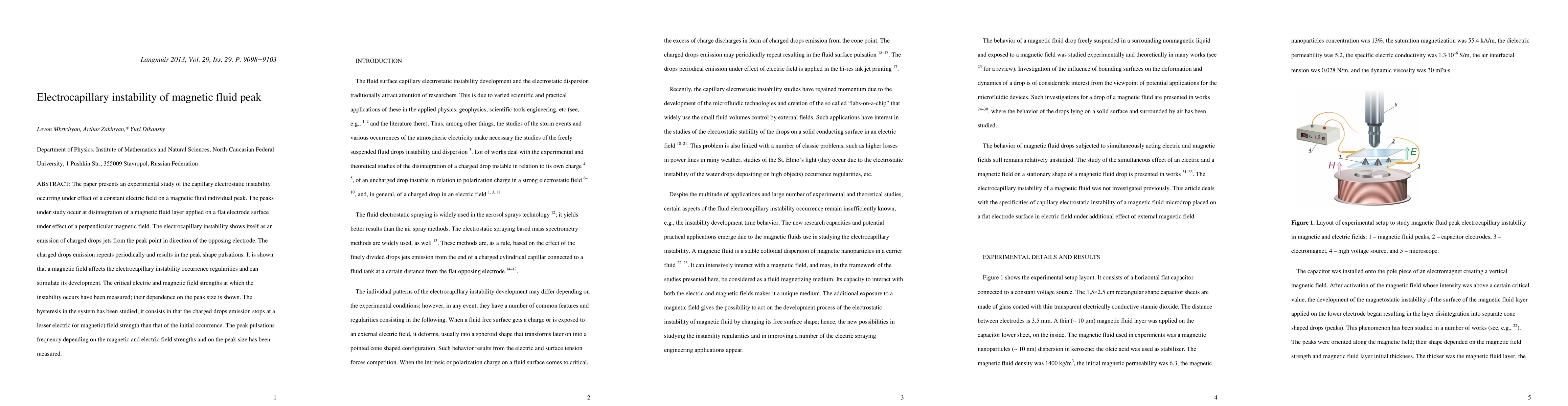 The paper presents an experimental study of the capillary electrostatic instability occurring under effect of a constant electric field on a magnetic fluid individual peak. The peaks under study occur at disintegration of a magnetic fluid layer applied on a flat electrode surface under effect of a perpendicular magnetic field. The electrocapillary instability shows itself as an emission of charged drops jets from the peak point in direction of the opposing electrode. The charged drops emission repeats periodically and results in the peak shape pulsations. It is shown that a magnetic field affects the electrocapillary instability occurrence regularities and can stimulate its development. The critical electric and magnetic field strengths at which the instability occurs have been measured; their dependence on the peak size is shown. The hysteresis in the system has been studied; it consists in that the charged drops emission stops at a lesser electric (or magnetic) field strength than that of the initial occurrence. The peak pulsations frequency depending on the magnetic and electric field strengths and on the peak size has been measured.