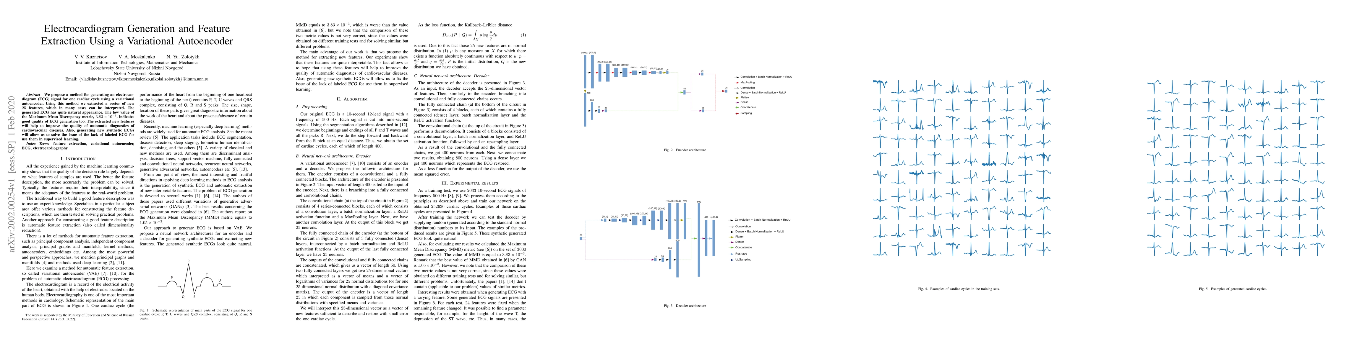 We propose a method for generating an electrocardiogram (ECG) signal for one cardiac cycle using a variational autoencoder. Using this method we extracted a vector of new 25 features, which in many cases can be interpreted. The generated ECG has quite natural appearance. The low value of the Maximum Mean Discrepancy metric, 0.00383, indicates good quality of ECG generation too. The extracted new features will help to improve the quality of automatic diagnostics of cardiovascular diseases. Also, generating new synthetic ECGs will allow us to solve the issue of the lack of labeled ECG for use them in supervised learning.
