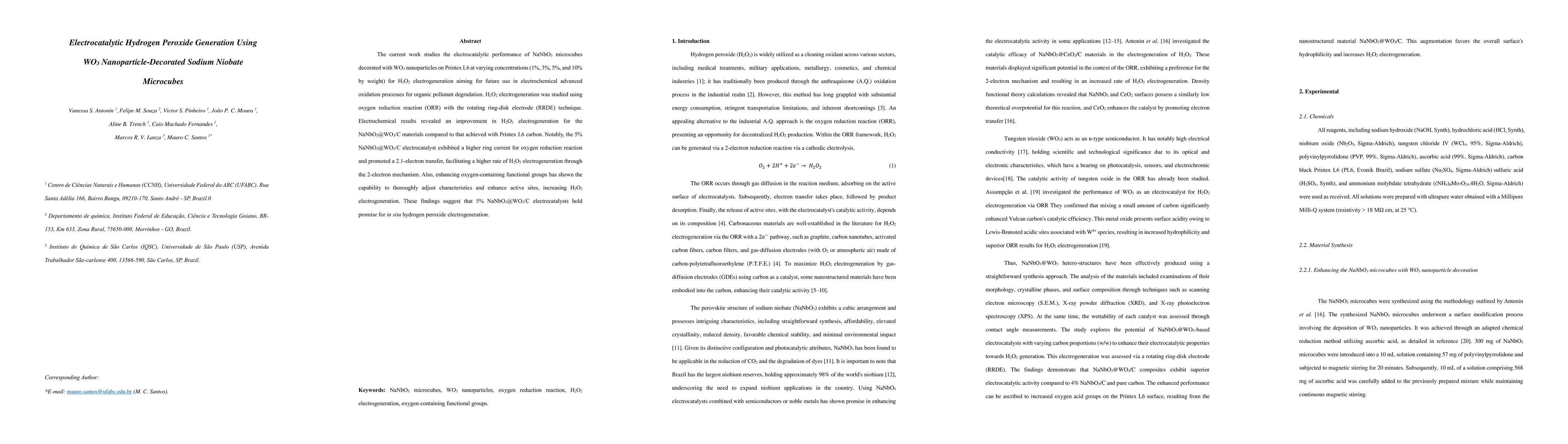 This work is novel due to the systematic investigation of WO3 nanoparticle concentrations on NaNbO3 microcubes and their enhanced electrocatalytic performance for H2O2 generation compared to pristine carbon.