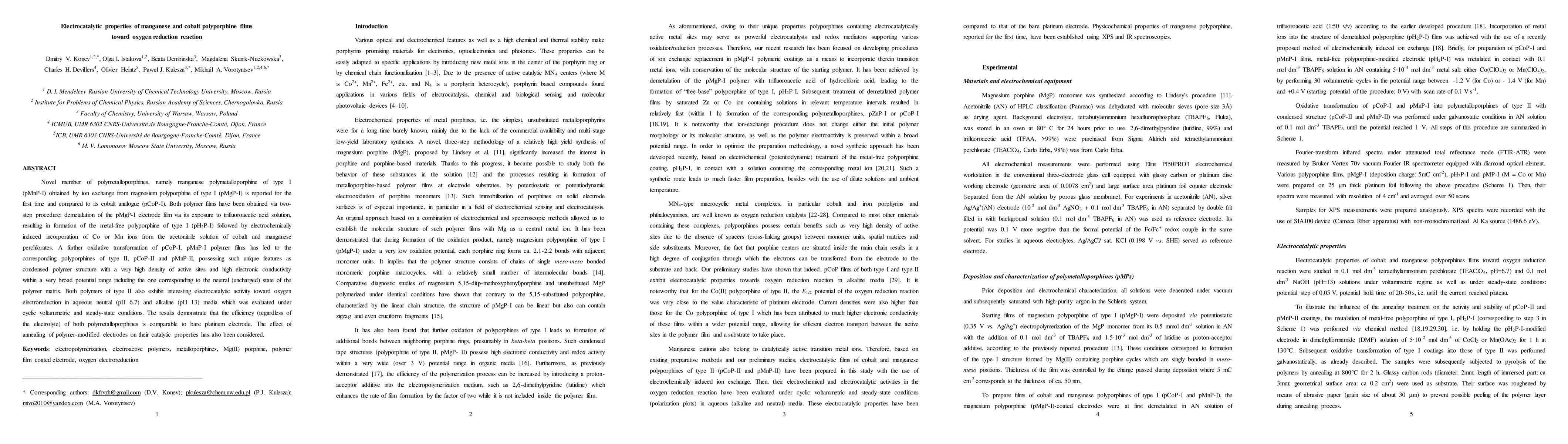 Novel member of polymetalloporphines, namely manganese polymetalloporphine of type I (pMnP-I) obtained by ion exchange from magnesium polyporphine of type I (pMgP-I) is reported for the first time and compared to its cobalt analogue (pCoP-I). Both polymer films have been obtained via two-step procedure: demetalation of the pMgP-I electrode film via its exposure to trifluoroacetic acid solution, resulting in formation of the metal-free polyporphine of type I (pH2P-I) followed by electrochemically induced incorporation of Co or Mn ions from the acetonitrile solution of cobalt and manganese perchlorates. A further oxidative transformation of pCoP-I, pMnP-I polymer films has led to the corresponding polyporphines of type II, pCoP-II and pMnP-II, possessing such unique features as condensed polymer structure with a very high density of active sites and high electronic conductivity within a very broad potential range including the one corresponding to the neutral (uncharged) state of the polymer matrix. Both polymers of type II also exhibit interesting electrocatalytic activity toward oxygen electroreduction in aqueous neutral (pH 6.7) and alkaline (pH 13) media which was evaluated under cyclic voltammetric and steady-state conditions. The results demonstrate that the efficiency (regardless of the electrolyte) of both polymetalloporphines is comparable to bare platinum electrode. The effect of annealing of polymer-modified electrodes on their catalytic properties has also been considered.