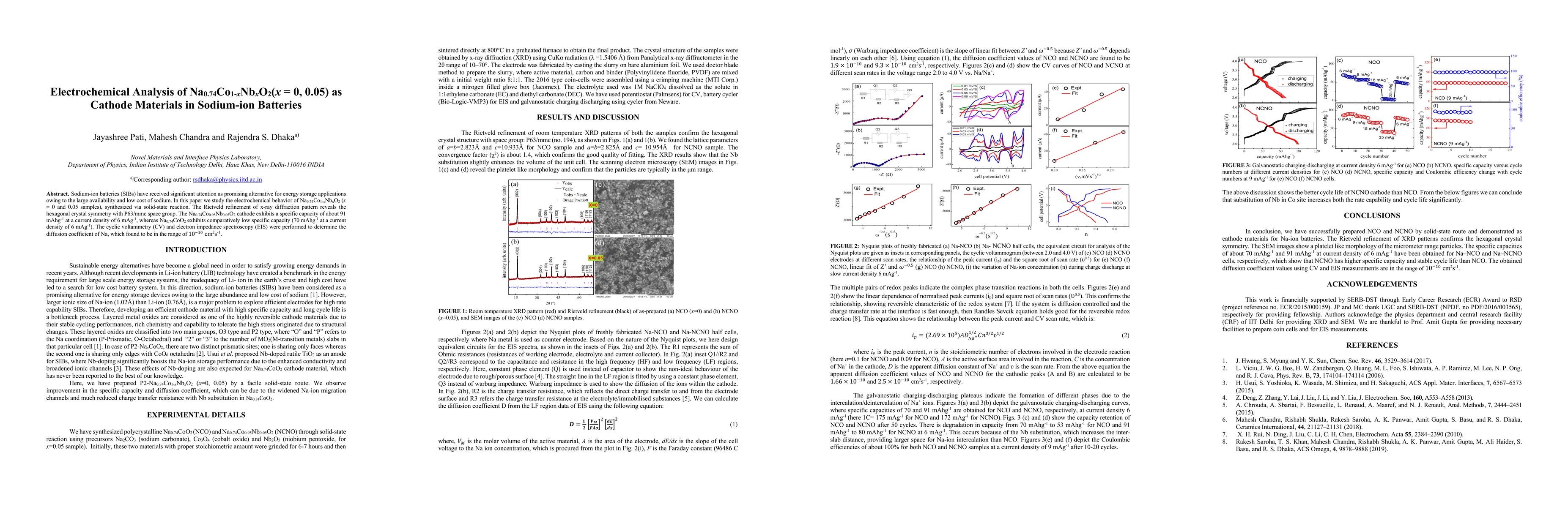 Sodium-ion batteries (SIBs) have received significant attention as promising alternative for energy storage applications owing to the large availability and low cost of sodium. In this paper we study the electrochemical behavior of Na$_{0.74}$Co$_{1-x}$Nb$_x$O$_2$ ($x=$ 0 and 0.05 samples), synthesized via solid-state reaction. The Rietveld refinement of x-ray diffraction patterns reveals the hexagonal crystal symmetry with P63/mmc space group. The Na$_{0.74}$Co$_{0.95}$Nb$_{0.05}$O$_2$ cathode exhibits a specific capacity of about 91 mAhg$^{-1}$ at a current density of 6 mAg$^{-1}$, whereas Na$_{0.74}$CoO$_2$ exhibits comparatively low specific capacity (70 mAhg$^{-1}$ at a current density of 6 mAg$^{-1}$). The cyclic voltammetry (CV) and electron impedance spectroscopy (EIS) were performed to determine the diffusion coefficient of Na, which found to be in the range of 10$^{-10}$ cm$^2$s$^{-1}$.