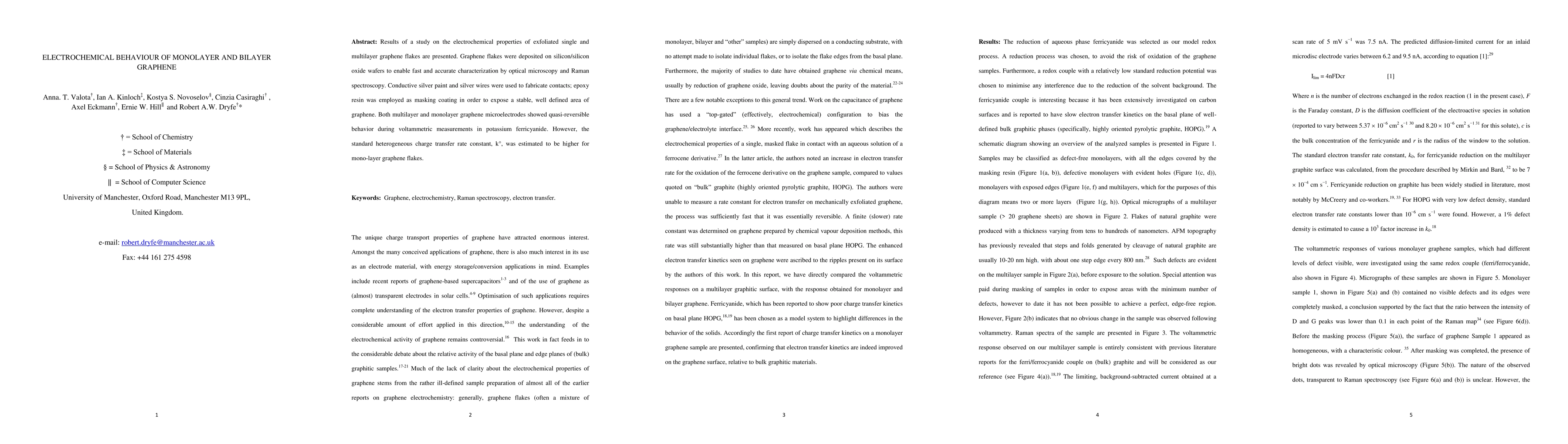 Results of a study on the electrochemical properties of exfoliated single and multilayer graphene flakes are presented. Graphene flakes were deposited on silicon/silicon oxide wafers to enable fast and accurate characterization by optical microscopy and Raman spectroscopy. Conductive silver paint and silver wires were used to fabricate contacts; epoxy resin was employed as masking coating in order to expose a stable, well defined area of graphene. Both multilayer and monolayer graphene microelectrodes showed quasi-reversible behavior during voltammetric measurements in potassium ferricyanide. However, the standard heterogeneous charge transfer rate constant, k{\deg}, was estimated to be higher for mono-layer graphene flakes.