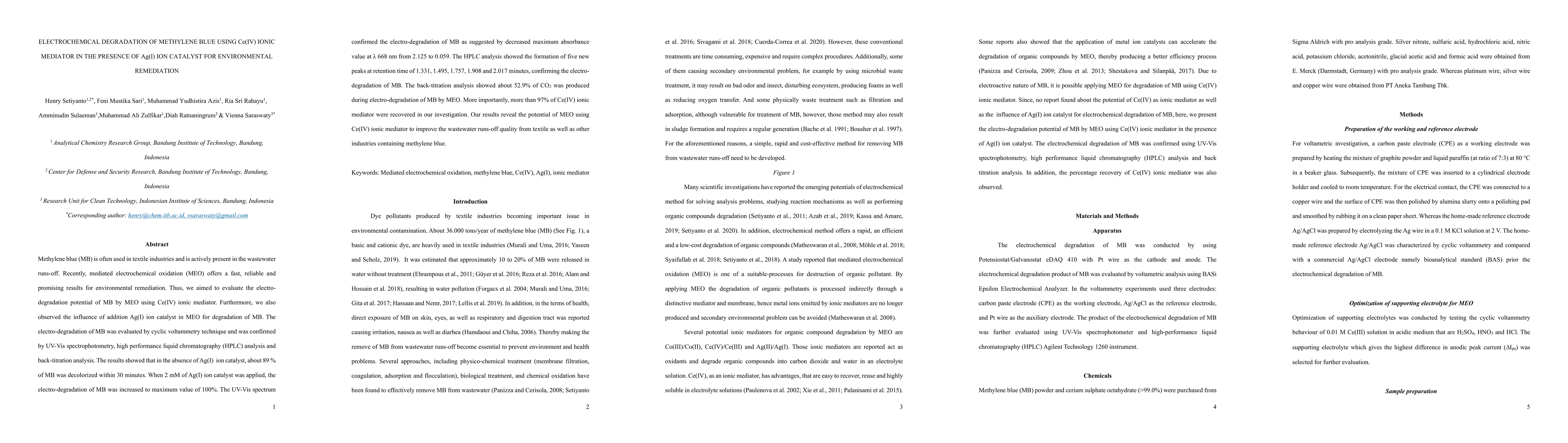 This study investigates the electrochemical degradation of methylene blue using Ce(IV) ionic mediator in mediated electrochemical oxidation (MEO) and finds that adding Ag(I) ion catalyst enhances the degradation process, achieving 100% decolorization within 30 minutes.