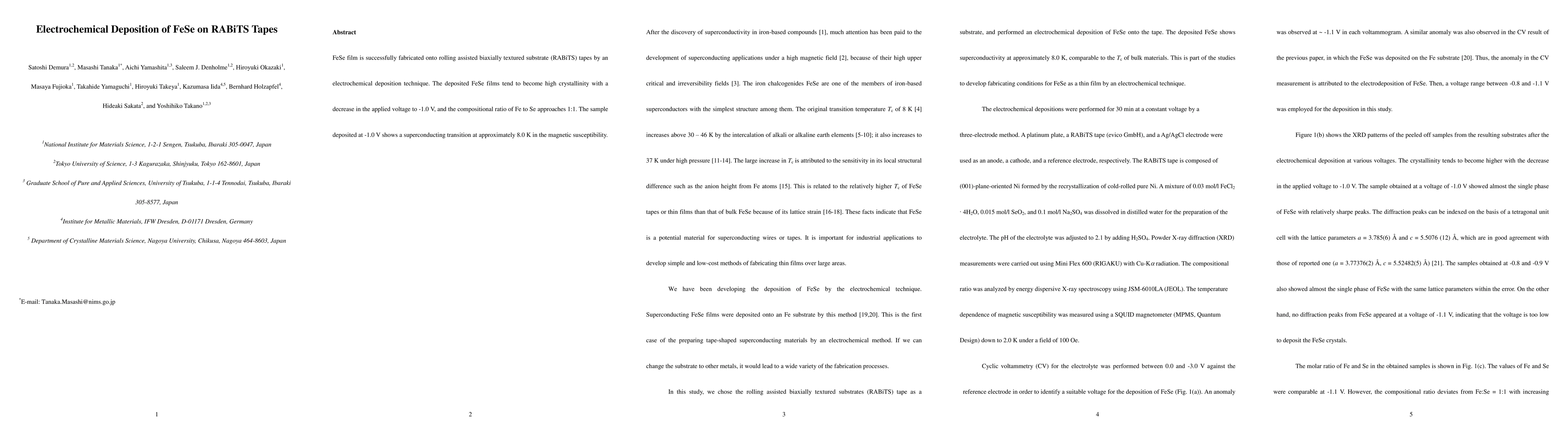 FeSe film is successfully fabricated onto Rolling Assisted Biaxially Textured Substrate (RABiTS) tapes by an electrochemical deposition technique. The deposited FeSe films tend to become high crystallinity with a decrease in the applied voltage to -1.0 V, and the compositional ratio of Fe to Se approaches 1:1. The sample deposited at -1.0 V shows a superconducting transition approximately 8.0 K in the magnetic susceptibility.