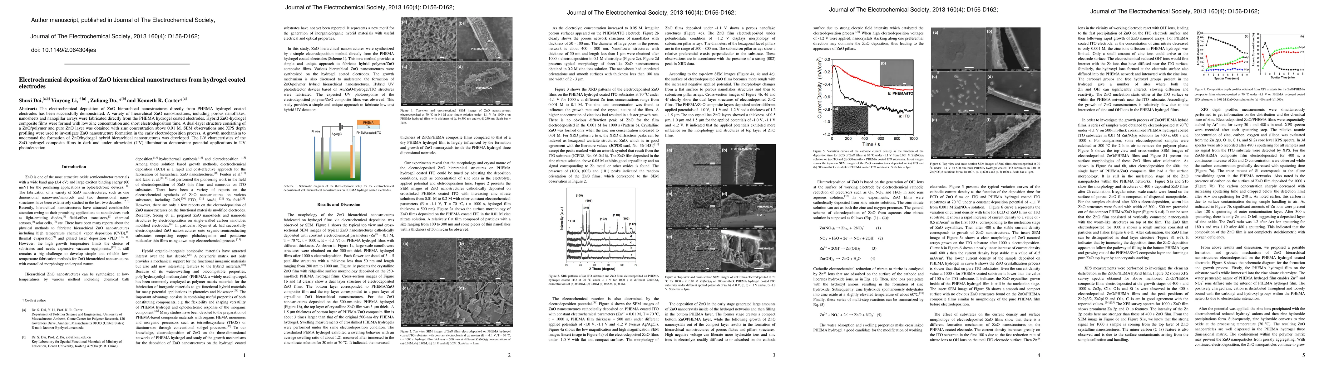This paper demonstrates the electrochemical deposition of ZnO hierarchical nanostructures from PHEMA hydrogel coated electrodes, resulting in various structures like porous nanoflakes and nanopillar arrays. The study also explores the growth mechanism and potential UV photodetection applications of the ZnO-hydrogel composite films.