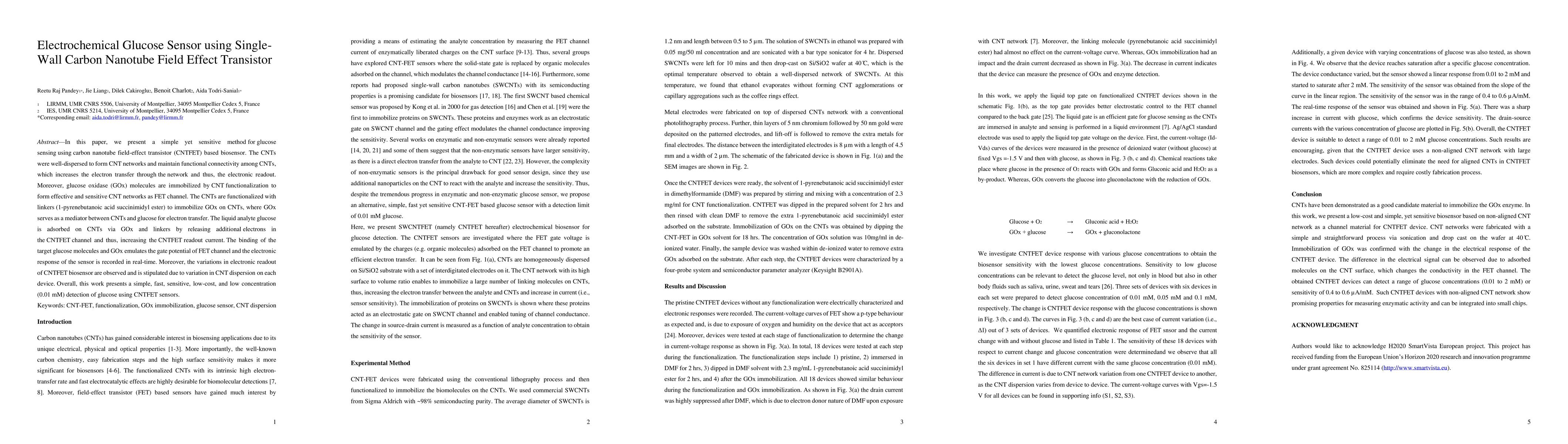This paper introduces a sensitive glucose sensor utilizing carbon nanotube field-effect transistors (CNTFETs) with functionalized CNT networks and immobilized glucose oxidase, enabling real-time detection at low concentrations (0.01 mM) through enhanced electron transfer and FET readout current changes. Variations in sensor performance are attributed to differences in CNT dispersion.