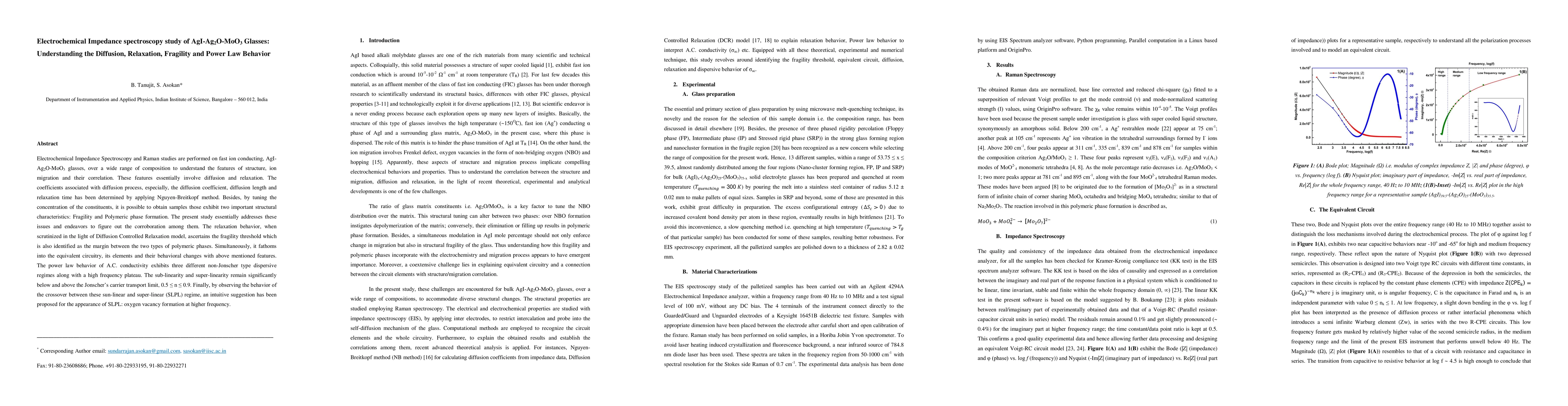 Electrochemical Impedance Spectroscopy and Raman studies are performed on fast ion conducting, AgI-Ag2O-MoO3 glasses, over a wide range of composition to understand the features of structure, ion migration and their correlation. These features essentially involve diffusion and relaxation. The coefficients associated with diffusion process, especially, the diffusion coefficient, diffusion length and relaxation time has been determined by applying Nguyen-Breitkopf method. Besides, by tuning the concentration of the constituents, it is possible to obtain samples those exhibit two important structural characteristics; Fragility and Polymeric phase formation. The present study essentially addresses these issues and endeavors to figure out the corroboration among them. The relaxation behavior, when scrutinized in the light of Diffusion Controlled Relaxation model, ascertains the fragility threshold which is also identified as the margin between the two types of polymeric phases. Simultaneously, it fathoms into the equivalent circuitry, its elements and their behavioral changes with above mentioned features. The power law behavior of A.C. conductivity exhibits three different non-Jonscher type dispersive regimes along with a high frequency plateau. The sub-linearity and super-linearity remain significantly below and above the Jonscher's carrier transport limit, 0.5 < n < 0.9. Finally, by observing the behavior of the crossover between these sub-linear and super-linear (SLPL) regime, an intuitive suggestion has been proposed for the appearance of SLPL; oxygen vacancy formation at higher frequency.