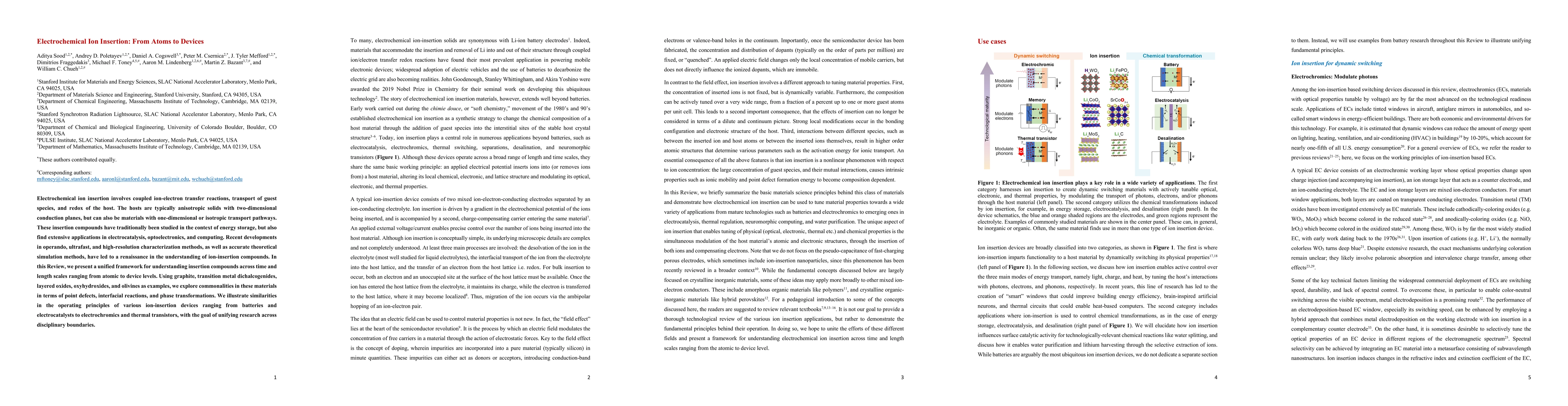 This paper reviews electrochemical ion insertion mechanisms, emphasizing recent advancements in characterization and theoretical methods. It unifies understanding of insertion compounds from atomic to device scales, highlighting commonalities in materials like graphite and layered oxides, and aims to bridge research across diverse applications in energy storage, catalysis, and electronics.